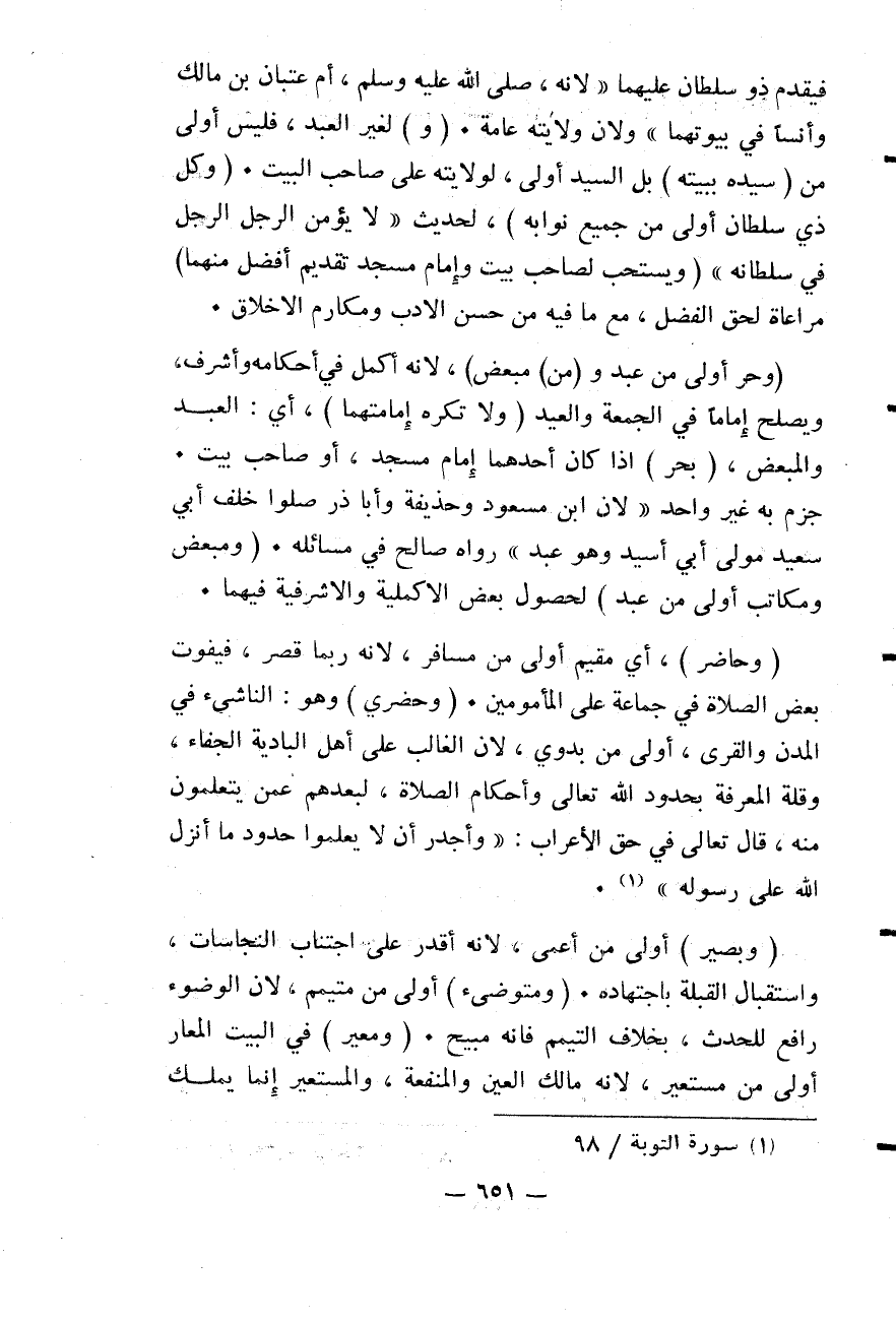 (وَحَضَرِيٌّ) وَهُوَ: النَّاشِئُ فِي الْمُدُنِ وَالْقُرَى، أَوْلَى مِنْ بَدْوِيٍّ؛ لِأَنَّ الْغَالِبَ عَلَى أَهْلِ الْبَادِيَةِ الْجَفَاءُ، وَقِلَّةُ الْمَعْرِفَةِ بِحُدُودِ اللَّهِ تَعَالَى وَأَحْكَامِ الصَّلَاةِ، لِبُعْدِهِمْ عَمَّنْ يَتَعَلَّمُونَ مِنْهُ، قَالَ تَعَالَى فِي حَقِّ الْأَعْرَابِ: {وَأَجْدَرُ أَلا يَعْلَمُوا حُدُودَ مَا أَنْزَلَ اللَّهُ عَلَى رَسُولِهِ} [التوبة: 97] .