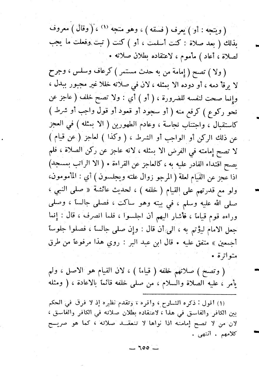 (أَوْ) أَيْ: وَلَا تَصِحُّ خَلْفَ (عَاجِزٍ عَنْ نَحْوِ رُكُوعٍ) كَرَفْعٍ مِنْهُ (أَوْ سُجُودٍ أَوْ قُعُودٍ أَوْ قَوْلٍ وَاجِبٍ أَوْ شَرْطٍ) كَاسْتِقْبَالٍ، وَاجْتِنَابِ نَجَاسَةٍ، وَعَادِمِ الطَّهُورَيْنِ (إلَّا بِمِثْلِهِ) فِي الْعَجْزِ عَنْ ذَلِكَ الرُّكْنِ أَوْ الْوَاجِبِ أَوْ الشَّرْطِ، (وَكَذَا) لِعَاجِزٍ (عَنْ قِيَامٍ) لَا تَصِحُّ إمَامَتُهُ فِي الْفَرْضِ إلَّا بِمِثْلِهِ؛ لِأَنَّهُ عَاجِزٌ عَنْ رُكْنِ الصَّلَاةِ، فَلَمْ يَصِحَّ اقْتِدَاءُ الْقَادِرِ عَلَيْهِ بِهِ، كَالْعَاجِزِ عَنْ الْقِرَاءَةِ. (إلَّا الرَّاتِبَ بِمَسْجِدٍ) إذَا عَجَزَ عَنْ الْقِيَامِ لِعِلَّةٍ (الْمَرْجُوَّ زَوَالُ عِلَّتِهِ وَيَجْلِسُونَ) أَيْ: الْمَأْمُومُونَ، وَلَوْ مَعَ قُدْرَتِهِمْ عَلَى الْقِيَامِ (خَلْفَهُ) ، لِحَدِيثِ عَائِشَةَ «صَلَّى النَّبِيُّ - صَلَّى اللَّهُ عَلَيْهِ وَسَلَّمَ - فِي بَيْتِهِ وَهُوَ سَاكِتٌ، فَصَلَّى جَالِسًا، وَصَلَّى وَرَاءَهُ قَوْمٌ قِيَامًا، فَأَشَارَ إلَيْهِمْ أَنْ اجْلِسُوا، فَلَمَّا انْصَرَفَ، قَالَ: إنَّمَا جُعِلَ الْإِمَامُ لِيُؤْتَمَّ بِهِ، إلَى أَنْ قَالَ: وَإِنْ صَلَّى جَالِسًا، فَصَلُّوا جُلُوسًا أَجْمَعِينَ» مُتَّفَقٌ عَلَيْهِ. قَالَ ابْنُ عَبْدِ الْبَرِّ رُوِيَ هَذَا مَرْفُوعًا مِنْ طُرُقٍ مُتَوَاتِرَةٍ.