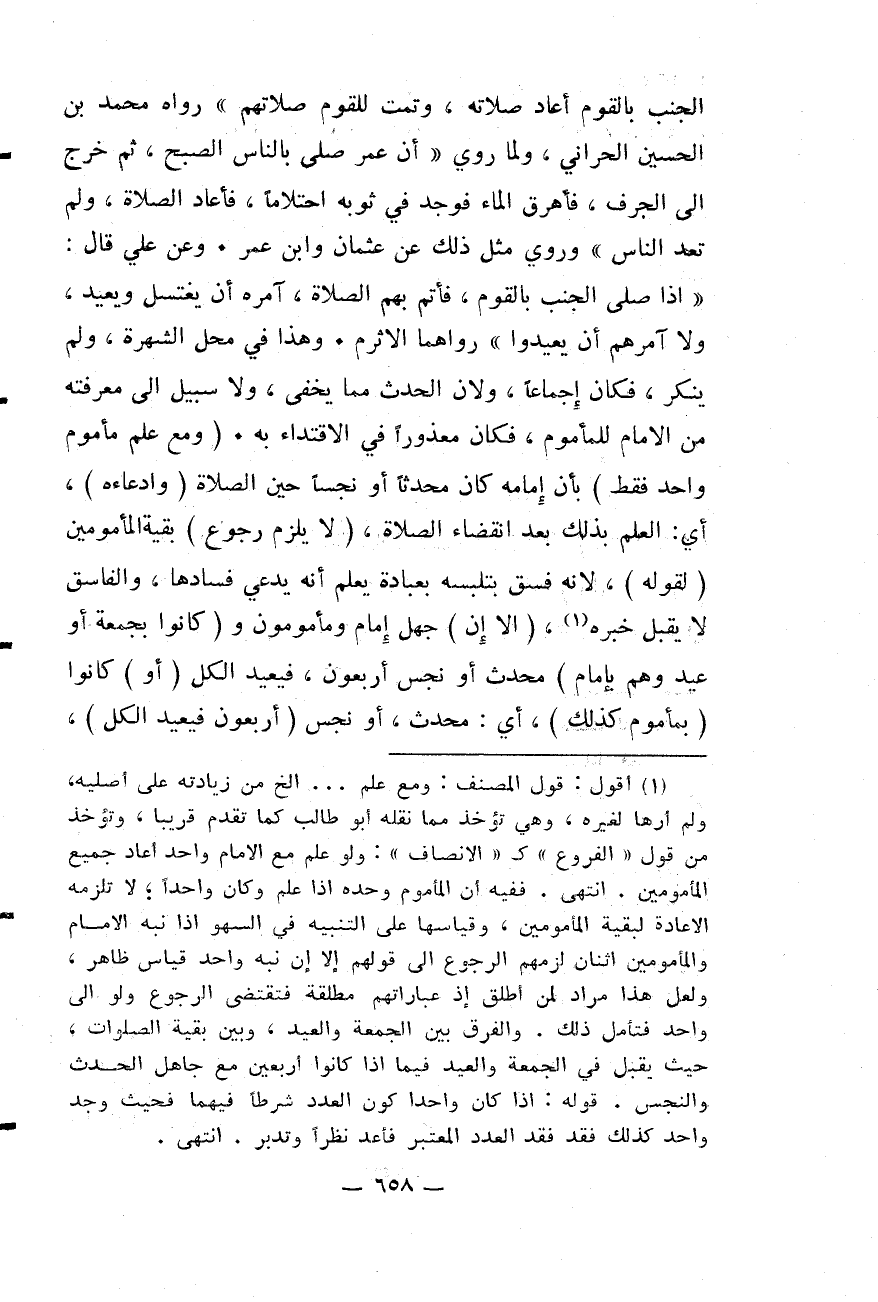 وَهَذَا فِي مَحَلِّ الشُّهْرَةِ، وَلَمْ يُنْكَرْ، فَكَانَ إجْمَاعًا؛ وَلِأَنَّ الْحَدَثَ مِمَّا يَخْفَى، وَلَا سَبِيلَ إلَى مَعْرِفَتِهِ مِنْ الْإِمَامِ لِلْمَأْمُومِ، فَكَانَ مَعْذُورًا فِي الِاقْتِدَاءِ بِهِ. (وَمَعَ عِلْمِ مَأْمُومٍ وَاحِدٍ فَقَطْ) بِأَنَّ إمَامَهُ كَانَ مُحْدِثًا أَوْ نَجِسًا حِينَ الصَّلَاةِ (وَادِّعَائِهِ) ، أَيْ: الْعِلْمَ بِذَلِكَ بَعْدَ انْقِضَاءِ الصَّلَاةِ، (لَا يَلْزَمُ رُجُوعُ) بَقِيَّةِ الْمَأْمُومِينَ (لِقَوْلِهِ) ؛ لِأَنَّهُ فَسَقَ بِتَلَبُّسِهِ بِعِبَادَةٍ يَعْلَمُ أَنَّهُ يَدَّعِي فَسَادَهَا، وَالْفَاسِقُ لَا يُقْبَلُ خَبَرُهُ، (إلَّا إنْ) جَهِلَ إمَامٌ وَمَأْمُومُونَ و (كَانُوا بِجُمُعَةٍ أَوْ عِيدٍ وَهُمْ بِإِمَامٍ) مُحْدِثٍ أَوْ نَجِسٍ أَرْبَعُونَ، فَيُعِيدُ الْكُلُّ (أَوْ) كَانُوا (بِمَأْمُومٍ كَذَلِكَ) ، أَيْ: مُحْدِثٍ، أَوْ نَجِسٍ (أَرْبَعُونَ فَيُعِيدُ الْكُلُّ) ،