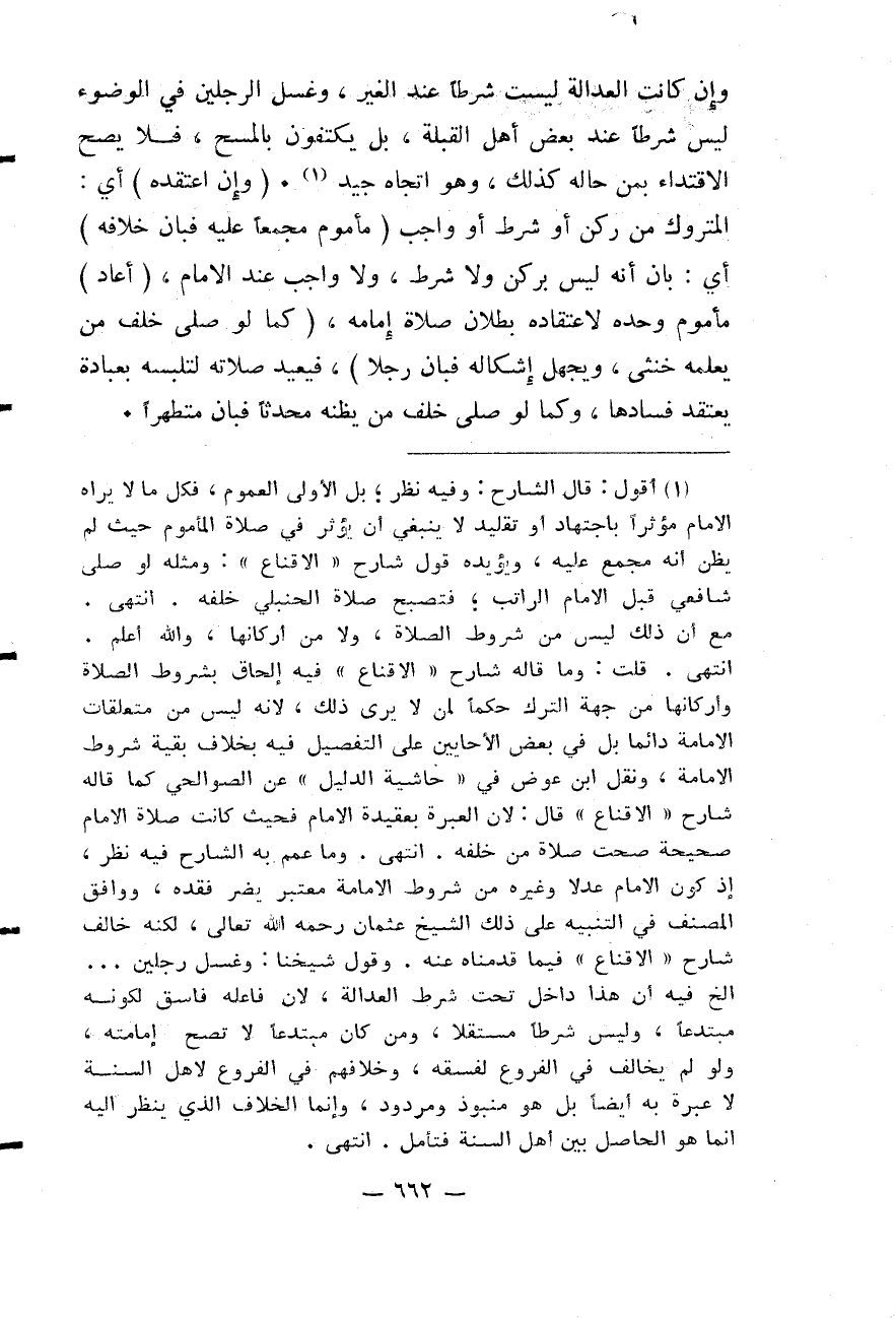 وَإِنْ كَانَتْ الْعَدَالَةُ لَيْسَتْ شَرْطًا عِنْدَ الْغَيْرِ، وَغَسْلُ الرِّجْلَيْنِ فِي الْوُضُوءِ لَيْسَ شَرْطًا عِنْدَ بَعْضِ أَهْلِ الْقِبْلَةِ، بَلْ يَكْتَفُونَ بِالْمَسْحِ، فَلَا يَصِحُّ الِاقْتِدَاءُ بِمَنْ حَالُهُ كَذَلِكَ، وَهُوَ اتِّجَاهٌ جَيِّدٌ.
