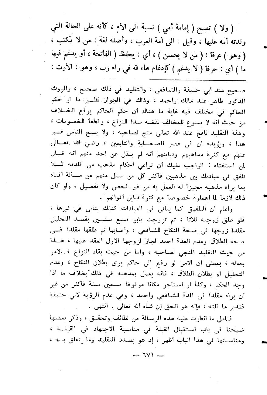 (وَلَا) تَصِحُّ (إمَامَةُ أُمِّيٍّ) نِسْبَةً إلَى الْأُمِّ، كَأَنَّهُ عَلَى الْحَالَةِ الَّتِي وَلَدَتْهُ أُمُّهُ عَلَيْهَا، وَقِيلَ: إلَى أُمَّةِ الْعَرَبِ، وَأَصْلُهُ لُغَةً: مَنْ لَا يَكْتُبُ، (وَهُوَ) عُرْفًا: (مَنْ لَا يُحْسِنُ) ، أَيْ: يَحْفَظُ (الْفَاتِحَةَ، أَوْ يُدْغِمُ فِيهَا مَا) أَيْ: حَرْفًا (لَا يُدْغَمُ) كَإِدْغَامِ هَاءِ لِلَّهِ فِي رَاءِ رَبِّ، وَهُوَ: الْأَرَتُّ: