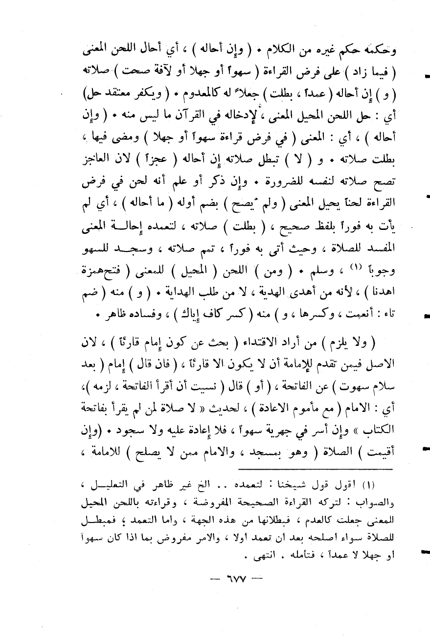 وَإِنْ ذَكَرَ أَوْ عَلِمَ أَنَّهُ لَحَنَ فِي فَرْضِ الْقِرَاءَةِ لَحْنًا يُحِيلُ الْمَعْنَى (وَلَمْ يُصِحَّ) بِضَمِّ أَوَّلِهِ (مَا أَحَالَهُ) ، أَيْ لَمْ يَأْتِ بِهِ فَوْرًا بِلَفْظٍ صَحِيحٍ، (بَطَلَتْ) صَلَاتُهُ، لِتَعَمُّدِهِ إحَالَةَ الْمَعْنَى الْمُفْسِدَ لِلصَّلَاةِ، وَحَيْثُ أَتَى بِهِ فَوْرًا، تَمَّمَ صَلَاتَهُ، وَسَجَدَ لِلسَّهْوِ وُجُوبًا، وَسَلَّمَ.
