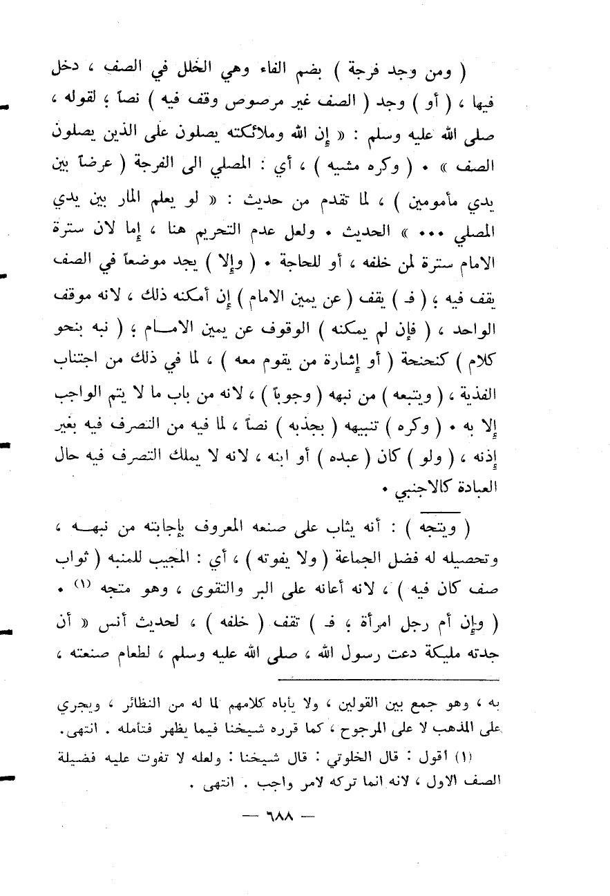 (وَمَنْ) (وَجَدَ فُرْجَةً) بِضَمِّ الْفَاءِ وَهِيَ الْخَلَلُ فِي الصَّفِّ، دَخَلَ فِيهَا، (أَوْ) وَجَدَ (الصَّفَّ غَيْرَ مَرْصُوصٍ وَقَفَ فِيهِ) نَصًّا؛ لِقَوْلِهِ - صَلَّى اللَّهُ عَلَيْهِ وَسَلَّمَ -: «إنَّ اللَّهَ وَمَلَائِكَتَهُ يُصَلُّونَ عَلَى الَّذِينَ يَصِلُونَ الصَّفَّ» .