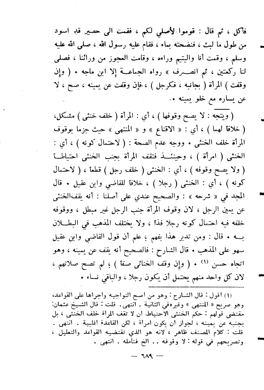 (وَيَتَّجِهُ: لَا يَصِحُّ وُقُوفُهَا) ، أَيْ: الْمَرْأَةِ (خَلْفَ خُنْثَى) مُشْكِلٍ، (خِلَافًا لَهُمَا) ، أَيْ: " الْإِقْنَاعِ " " وَالْمُنْتَهَى " حَيْثُ جَزَمَا بِوُقُوفِ الْمَرْأَةِ خَلْفَ الْخُنْثَى.
