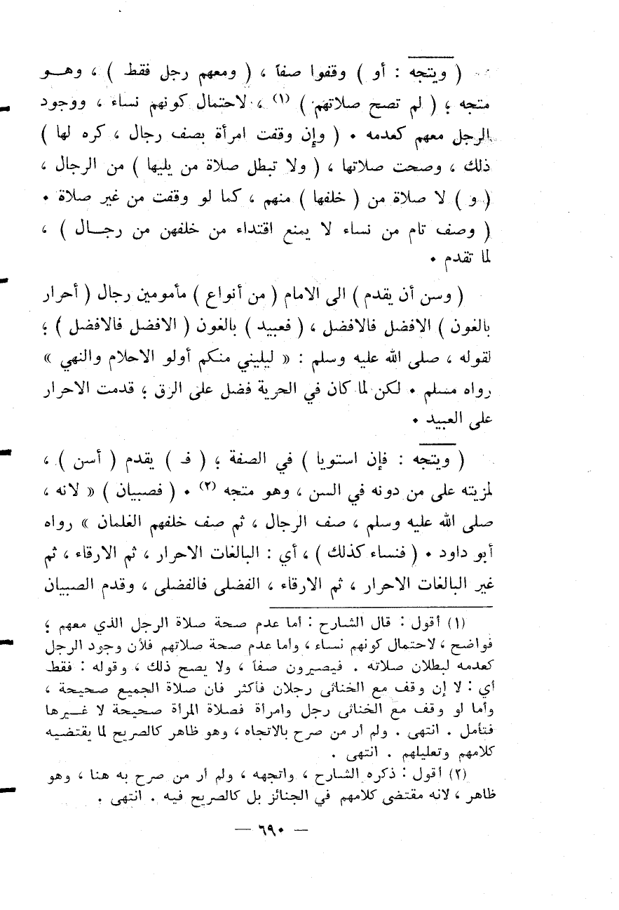 لَكِنْ لَمَّا كَانَ فِي الْحُرِّيَّةِ فَضْلٌ عَلَى الرِّقِّ؛ قُدِّمَتْ الْأَحْرَارُ عَلَى الْعَبِيدِ. (وَيَتَّجِهُ: فَإِنْ اسْتَوَيَا) فِي الصِّفَةِ؛ (ف) يُقَدَّمُ (أَسَنُّ) ، لِمَزِيَّتِهِ عَلَى مَنْ دُونَهُ فِي السِّنِّ، وَهُوَ مُتَّجِهٌ. (فَصِبْيَانٌ) لِأَنَّهُ - صَلَّى اللَّهُ عَلَيْهِ وَسَلَّمَ - «صَفَّ الرِّجَالَ، ثُمَّ صَفَّ خَلْفَهُمْ الْغِلْمَانَ» رَوَاهُ أَبُو دَاوُد. (فَنِسَاءٌ كَذَلِكَ) ، أَيْ: الْبَالِغَاتُ الْأَحْرَارُ، ثُمَّ الْأَرِقَّاءُ، ثُمَّ غَيْرُ الْبَالِغَاتِ الْأَحْرَارِ، ثُمَّ الْأَرِقَّاءُ.