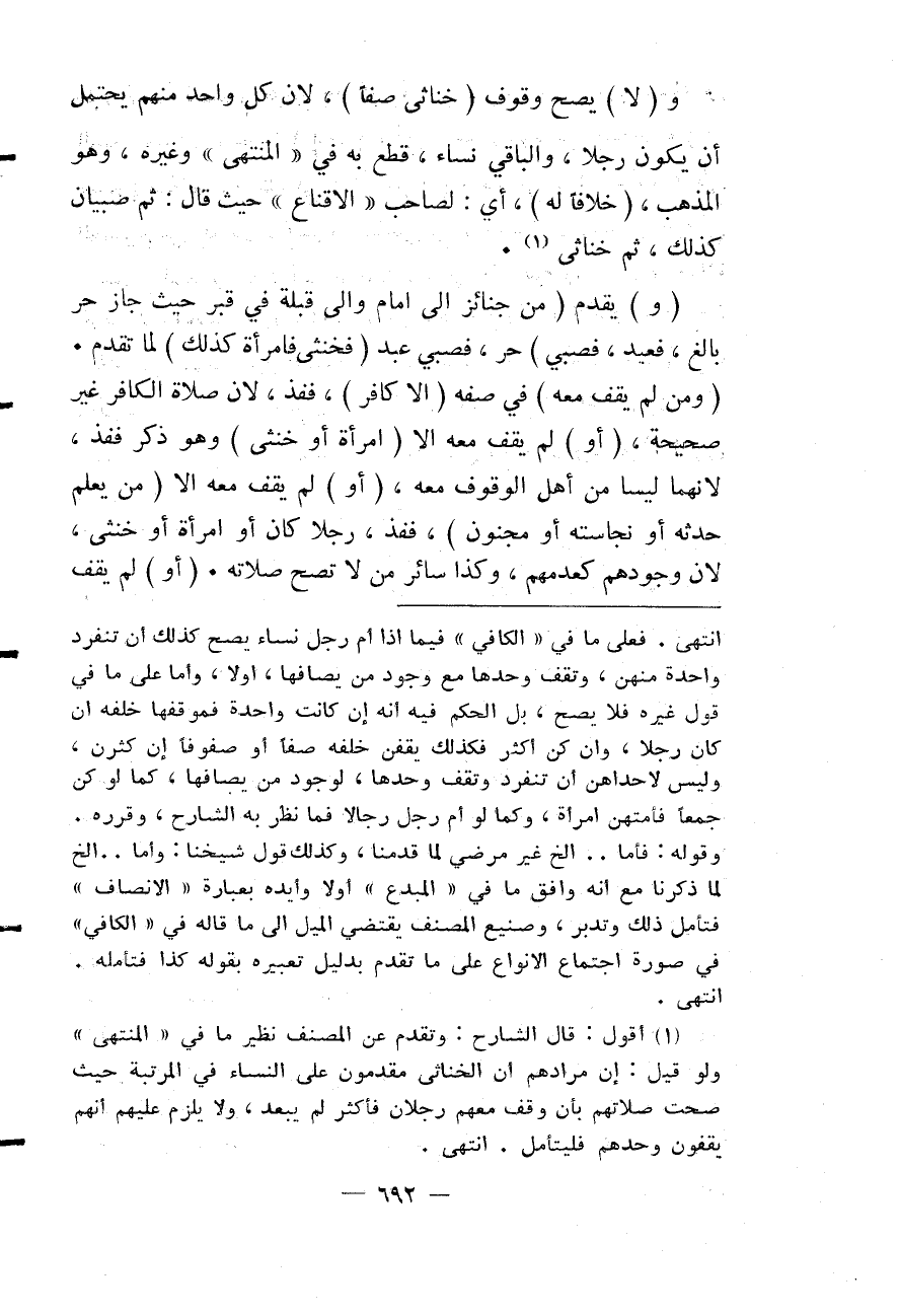 و (لَا) يَصِحُّ وُقُوفُ (خَنَاثَى صَفًّا) ؛ لِأَنَّ كُلَّ وَاحِدٍ مِنْهُمْ يُحْتَمَلُ أَنْ يَكُونَ رَجُلًا، وَالْبَاقِي نِسَاءً، قَطَعَ بِهِ فِي الْمُنْتَهَى " وَغَيْرِهِ، وَهُوَ الْمَذْهَبُ، (خِلَافًا لَهُ) ، أَيْ: لِصَاحِبِ " الْإِقْنَاعِ " حَيْثُ قَالَ: ثُمَّ صِبْيَانٌ كَذَلِكَ، ثُمَّ خَنَاثَى.