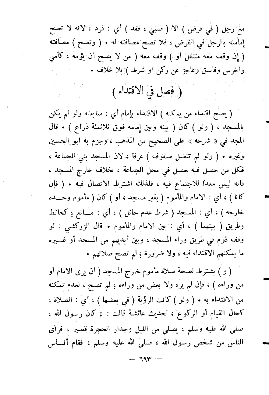(يَصِحُّ اقْتِدَاءُ مَنْ يُمْكِنُهُ) الِاقْتِدَاءُ بِإِمَامٍ أَيْ: مُتَابَعَتُهُ وَلَوْ لَمْ يَكُنْ بِالْمَسْجِدِ، (وَلَوْ) كَانَ (بَيْنَهُ وَبَيْنَ إمَامِهِ فَوْقَ ثَلَاثِمِائَةِ ذِرَاعٍ) . قَالَ الْمَجْدُ فِي شَرْحِهِ " عَلَى الصَّحِيحِ مِنْ الْمَذْهَبِ، وَجَزَمَ بِهِ أَبُو الْحُسَيْنِ وَغَيْرُهُ. (وَلَوْ لَمْ تَتَّصِلْ صُفُوفٌ) عُرْفًا؛ لِأَنَّ الْمَسْجِدَ بُنِيَ لِلْجَمَاعَةِ، فَكُلُّ مَنْ حَصَلَ فِيهِ حَصَلَ فِي مَحَلِّ الْجَمَاعَةِ، بِخِلَافِ خَارِجِ الْمَسْجِدِ، فَإِنَّهُ لَيْسَ مُعَدًّا لِلِاجْتِمَاعِ فِيهِ، فَلِذَلِكَ اُشْتُرِطَ الِاتِّصَالُ فِيهِ. (فَإِنْ كَانَا) ، أَيْ: الْإِمَامُ وَالْمَأْمُومُ (بِغَيْرِ مَسْجِدٍ، أَوْ) كَانَ (مَأْمُومٌ وَحْدَهُ خَارِجَهُ) ، أَيْ: الْمَسْجِدِ (شُرِطَ عَدَمُ حَائِلٍ) ، أَيْ: مَانِعٍ؛ كَحَائِطٍ وَطَرِيقٍ (بَيْنَهُمَا) ، أَيْ: بَيْنَ الْإِمَامِ وَالْمَأْمُومِ.
