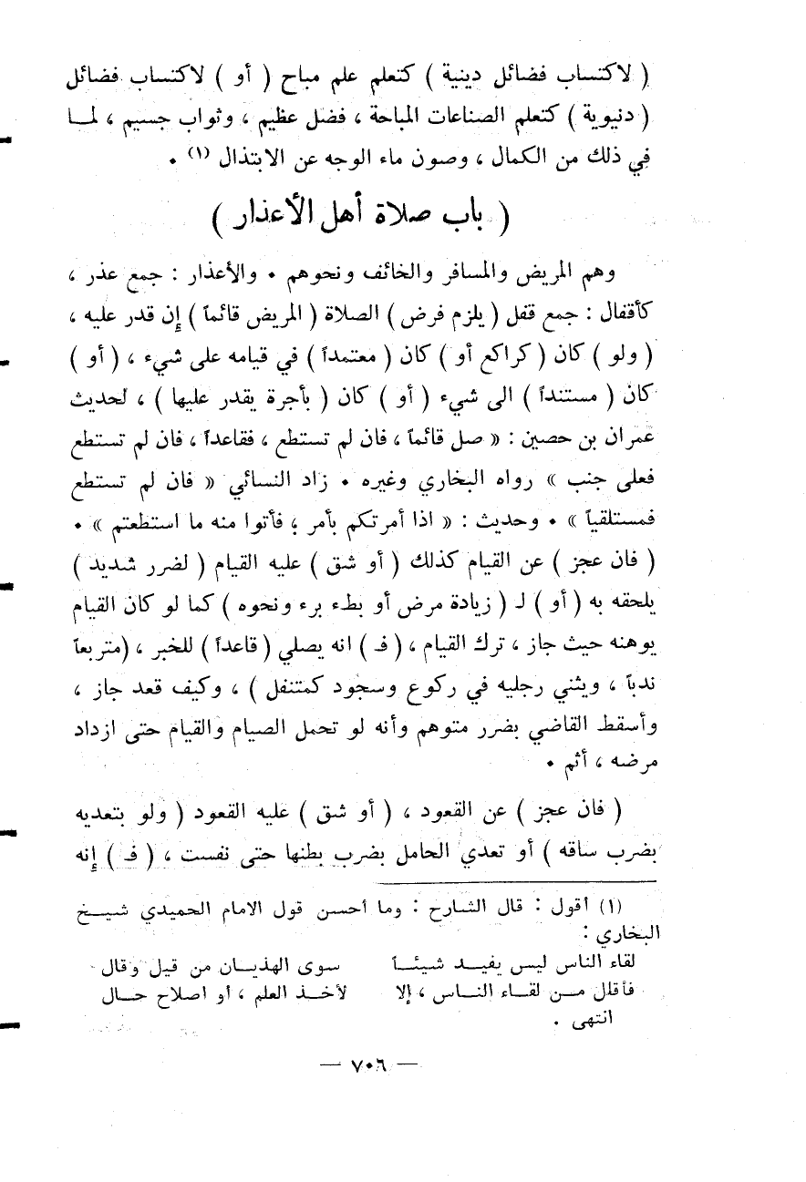 (بَابُ صَلَاةِ أَهْلِ الْأَعْذَارِ) وَهُمْ الْمَرِيضُ وَالْمُسَافِرُ وَالْخَائِفُ وَنَحْوُهُمْ