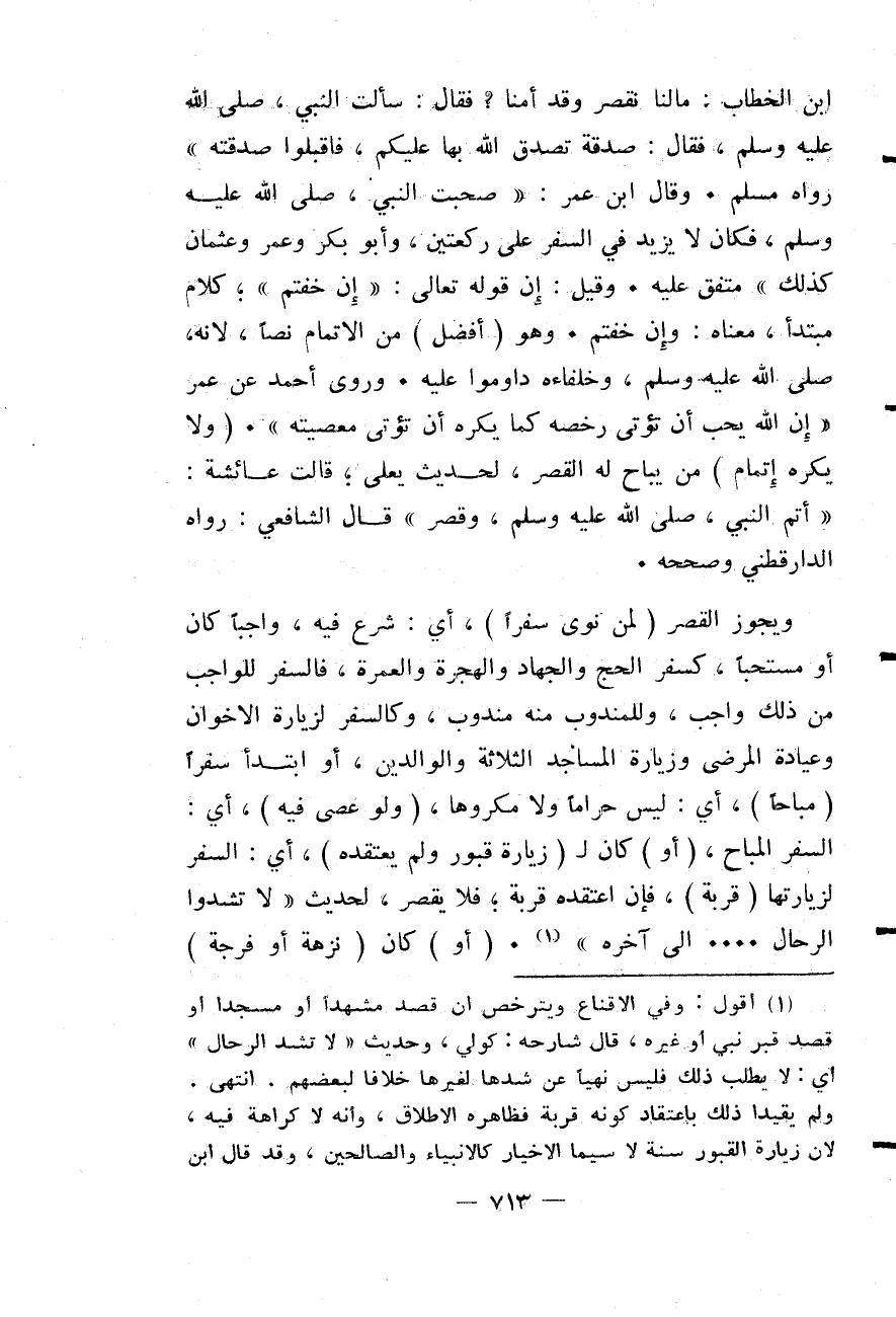 وَيَجُوزُ الْقَصْرُ (لِمَنْ نَوَى سَفَرًا) ، أَيْ: شَرَعَ فِيهِ، وَاجِبًا كَانَ أَوْ مُسْتَحَبًّا، كَسَفَرِ الْحَجِّ وَالْجِهَادِ وَالْهِجْرَةِ وَالْعُمْرَةِ، فَالسَّفَرُ لِلْوَاجِبِ مِنْ ذَلِكَ وَاجِبٌ، وَلِلْمَنْدُوبِ مِنْهُ مَنْدُوبٌ، وَكَالسَّفَرِ لِزِيَارَةِ الْإِخْوَانِ وَعِيَادَةِ الْمَرْضَى وَزِيَارَةِ الْمَسَاجِدِ الثَّلَاثَةِ وَالْوَالِدَيْنِ، أَوْ ابْتَدَأَ سَفَرًا (مُبَاحًا) ، أَيْ: لَيْسَ حَرَامًا وَلَا مَكْرُوهًا، (وَلَوْ عَصَى فِيهِ) ، أَيْ: السَّفَرِ الْمُبَاحِ، (أَوْ) كَانَ لِ (زِيَارَةِ قُبُورٍ وَلَمْ يَعْتَقِدْهُ) ، أَيْ: السَّفَرَ لِزِيَارَتِهَا (قُرْبَةً) ، فَإِنْ اعْتَقَدَهُ قُرْبَةً؛ فَلَا يَقْصُرُ، لِحَدِيثِ «لَا تَشُدُّوا الرِّحَالَ» . . . إلَى آخِرِهِ.