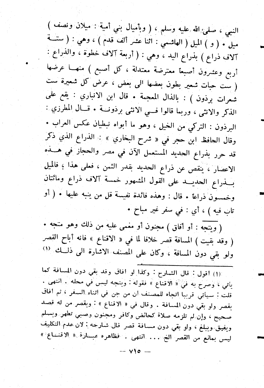 النَّبِيِّ - صَلَّى اللَّهُ عَلَيْهِ وَسَلَّمَ - (وَبِأَمْيَالِ بَنِي أُمَيَّةَ: مِيلَانِ وَنِصْفُ) مِيلٍ. (وَ) الْمِيلُ (الْهَاشِمِيُّ: اثْنَا عَشَرَ أَلْفَ قَدَمٍ) ، وَهِيَ: (سِتَّةُ آلَافِ ذِرَاعٍ) بِذِرَاعِ الْيَدِ، وَهِيَ: (أَرْبَعَةُ آلَافِ خُطْوَةٍ، وَالذِّرَاعُ: أَرْبَعٌ وَعِشْرُونَ إصْبَعًا مُعْتَرِضَةً مُعْتَدِلَةً، كُلُّ إصْبَعٍ) مِنْهَا عَرْضُهَا (سِتُّ حَبَّاتِ شَعِيرٍ بُطُونُ بَعْضِهَا إلَى بَعْضٍ، عَرْضُ كُلِّ شَعِيرَةٍ سِتُّ شَعَرَاتٍ بِرْذَوْنَ) : بِالذَّالِ الْمُعْجَمَةِ. قَالَ ابْنُ الْأَنْبَارِيِّ: يَقَعُ عَلَى الذَّكَرِ وَالْأُنْثَى، وَرُبَّمَا قَالُوا فِي الْأُنْثَى بِرْذَوْنَةُ. قَالَ الْمُطَرِّزِيُّ: الْبِرْذَوْنُ: التُّرْكِيُّ مِنْ الْخَيْلِ، وَهُوَ مَا أَبَوَاهُ نَبَطِيَّانِ عَكْسُ الْعِرَابِ. وَقَالَ الْحَافِظُ ابْنُ حَجَرٍ فِي شَرْحِ الْبُخَارِيِّ ": الذِّرَاعُ الَّذِي ذُكِرَ قَدْ حُرِّرَ بِذِرَاعِ الْحَدِيدِ الْمُسْتَعْمَلِ الْآنَ فِي مِصْرَ وَالْحِجَازِ فِي هَذِهِ الْأَعْصَارِ، يَنْقُصُ عَنْ ذِرَاعِ الْحَدِيدِ بِقَدْرِ الثُّمُنِ، فَعَلَى هَذَا؛ فَالْمِيلُ بِذِرَاعِ الْحَدِيدِ عَلَى الْقَوْلِ الْمَشْهُورِ خَمْسَةُ آلَافِ ذِرَاعٍ وَمِائَتَانِ وَخَمْسُونَ ذِرَاعًا. قَالَ: وَهَذِهِ فَائِدَةٌ نَفِيسَةٌ قَلَّ مَنْ يُنَبِّهُ عَلَيْهَا. (أَوْ تَابَ فِيهِ) ، أَيْ: فِي سَفَرٍ غَيْرِ مُبَاحٍ. (وَيَتَّجِهُ: أَوْ أَفَاقَ) مَجْنُونٌ أَوْ مُغْمًى عَلَيْهِ مِنْ ذَلِكَ وَهُوَ مُتَّجِهٌ. (وَقَدْ بَقِيَتْ) الْمَسَافَةُ قَصَرَ خِلَافًا لِمَا فِي الْإِقْنَاعِ " فَإِنَّهُ أَبَاحَ الْقَصْرَ وَلَوْ بَقِيَ دُونَ الْمَسَافَةِ، وَكَانَ عَلَى الْمُصَنِّفِ الْإِشَارَةُ إلَى ذَلِكَ