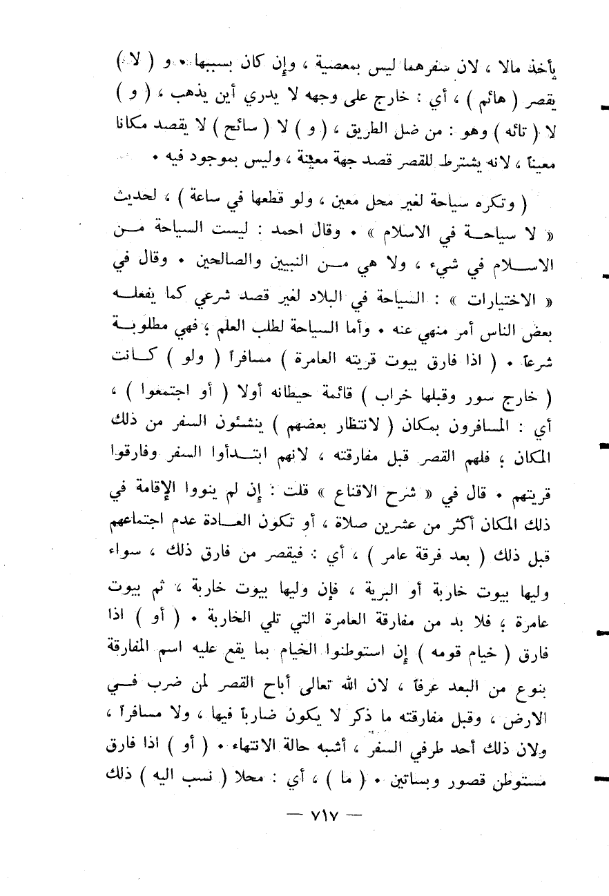 قَالَ فِي شَرْحِ الْإِقْنَاعِ " قُلْت: إنْ لَمْ يَنْوُوا الْإِقَامَةَ فِي ذَلِكَ الْمَكَانِ أَكْثَرَ مِنْ عِشْرِينَ صَلَاةٍ، أَوْ تَكُونُ الْعَادَةُ عَدَمَ اجْتِمَاعِهِمْ قَبْلَ ذَلِكَ (بَعْدَ فُرْقَةِ عَامِرٍ) ، أَيْ: فَيَقْصُرُ مَنْ فَارَقَ ذَلِكَ، سَوَاءٌ وَلِيَهَا بُيُوتٌ خَارِبَةٌ أَوْ الْبَرِّيَّةُ، فَإِنْ وَلِيَهَا بُيُوتٌ خَارِبَةٌ، ثُمَّ بُيُوتٌ عَامِرَةٌ؛ فَلَا بُدَّ مِنْ مُفَارَقَةِ الْعَامِرَةِ الَّتِي تَلِي الْخَارِبَةَ. (أَوْ) إذَا فَارَقَ (خِيَامَ قَوْمِهِ) إنْ اسْتَوْطَنُوا الْخِيَامَ بِمَا يَقَعُ عَلَيْهِ اسْمُ الْمُفَارَقَةِ بِنَوْعٍ مِنْ الْبُعْدِ عُرْفًا، لِأَنَّ اللَّهَ تَعَالَى أَبَاحَ الْقَصْرَ لِمَنْ ضَرَبَ فِي الْأَرْضِ، وَقَبْلَ مُفَارَقَتِهِ مَا ذُكِرَ لَا يَكُونُ ضَارِبًا فِيهَا، وَلَا مُسَافِرًا، وَلِأَنَّ ذَلِكَ أَحَدُ طَرَفَيْ السَّفَرِ، أَشْبَهَ حَالَةَ الِانْتِهَاءِ. (أَوْ) إذَا فَارَقَ مُسْتَوْطِنٌ قُصُورَ وَبَسَاتِينَ. (مَا) ، أَيْ: مَحَلًّا (نُسِبَ إلَيْهِ) ذَلِكَ
