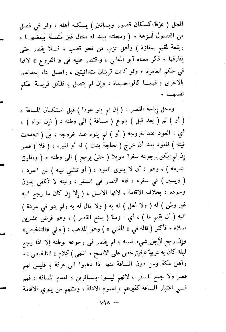 وَمَحَلُّ إبَاحَةِ الْقَصْرِ: (إنْ لَمْ يَنْوِ عَوْدًا) قَبْلَ اسْتِكْمَالِ الْمَسَافَةِ، (أَوْ) لَمْ (يَعُدْ قَبْلَ) بُلُوغِ (مَسَافَةٍ) إلَى وَطَنِهِ، (فَإِنْ نَوَاهُ) ، أَيْ: الْعَوْدَ عِنْدَ خُرُوجِهِ (أَوْ) لَمْ يَنْوِهِ عِنْدَ خُرُوجِهِ، بَلْ (تَجَدَّدَتْ نِيَّتُهُ) لِلْعَوْدِ بَعْدَ أَنْ خَرَجَ (لِحَاجَةٍ بَدَتْ) لَهُ أَوْ لِغَيْرِهِ، (فَلَا) قَصْرَ إنْ لَمْ يَكُنْ رُجُوعُهُ سَفَرًا طَوِيلًا (حَتَّى يَرْجِعَ) إلَى وَطَنِهِ. (وَيُفَارِقُ بِشَرْطِهِ) ، وَهُوَ: أَنْ لَا يَنْوِيَ الْعَوْدَ، (أَوْ تَنْثَنِيَ نِيَّتُهُ) عَنْ الْعَوْدِ، (وَيَسِيرُ) فِي سَفَرِهِ، فَلَهُ الْقَصْرُ فِي السَّفَرِ، وَنِيَّتُهُ لَا تَكْفِي بِدُونِ وُجُودِهِ، بِخِلَافِ الْإِقَامَةِ؛ لِأَنَّهَا الْأَصْلُ، (إلَّا إنْ كَانَ مَا رَجَعَ إلَيْهِ غَيْرَ وَطَنٍ) لَهُ (وَلَا أَهْلَ) لَهُ بِهِ (وَلَا مَالَ لَهُ بِهِ وَلَمْ يَنْوِ فِي عَوْدَةٍ) إلَيْهِ (أَنْ يُقِيمَ مَا) ، أَيْ: زَمَنًا (يَمْنَعُ الْقَصْرَ) ، وَهُوَ فَرْضُ عِشْرِينَ صَلَاةٍ فَأَكْثَرَ. (قَالَهُ فِي " الْمُغْنِي ") وَهُوَ الْمَذْهَبُ، (وَفِي " التَّلْخِيصِ " وَإِنْ رَجَعَ لِأَجْلِ شَيْءٍ نَسِيَهُ؛ لَمْ يَقْصُرْ فِي رُجُوعِهِ لِوَطَنِهِ إلَّا إذَا رَجَعَ لِبَلَدٍ كَانَ بِهِ غَرِيبًا، فَيَتَرَخَّصُ عَلَى الْأَصَحِّ انْتَهَى) كَلَامُ " التَّلْخِيصِ ".