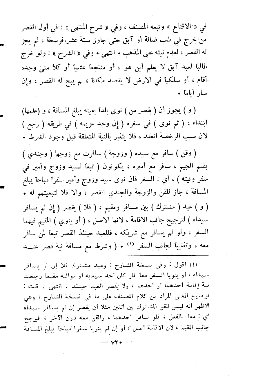 (وَ) عَبْدٌ (مُشْتَرَكٌ) بَيْنَ مُسَافِرٍ وَمُقِيمٍ، (فَلَا) يَقْصُرُ (إنْ لَمْ يُسَافِرْ سَيِّدَاهُ) لِتَرْجِيحِ جَانِبِ الْإِقَامَةِ؛ لِأَنَّهَا الْأَصْلُ، (أَوْ يَنْوِي) الْمُقِيمُ فِيهِمَا السَّفَرَ، وَلَوْ لَمْ يُسَافِرْ مَعَ شَرِيكِهِ، فَلِلْعَبْدِ حِينَئِذٍ الْقَصْرُ تَبَعًا لِمَنْ سَافَرَ مَعَهُ، وَتَغْلِيبًا لِجَانِبِ السَّفَرِ.