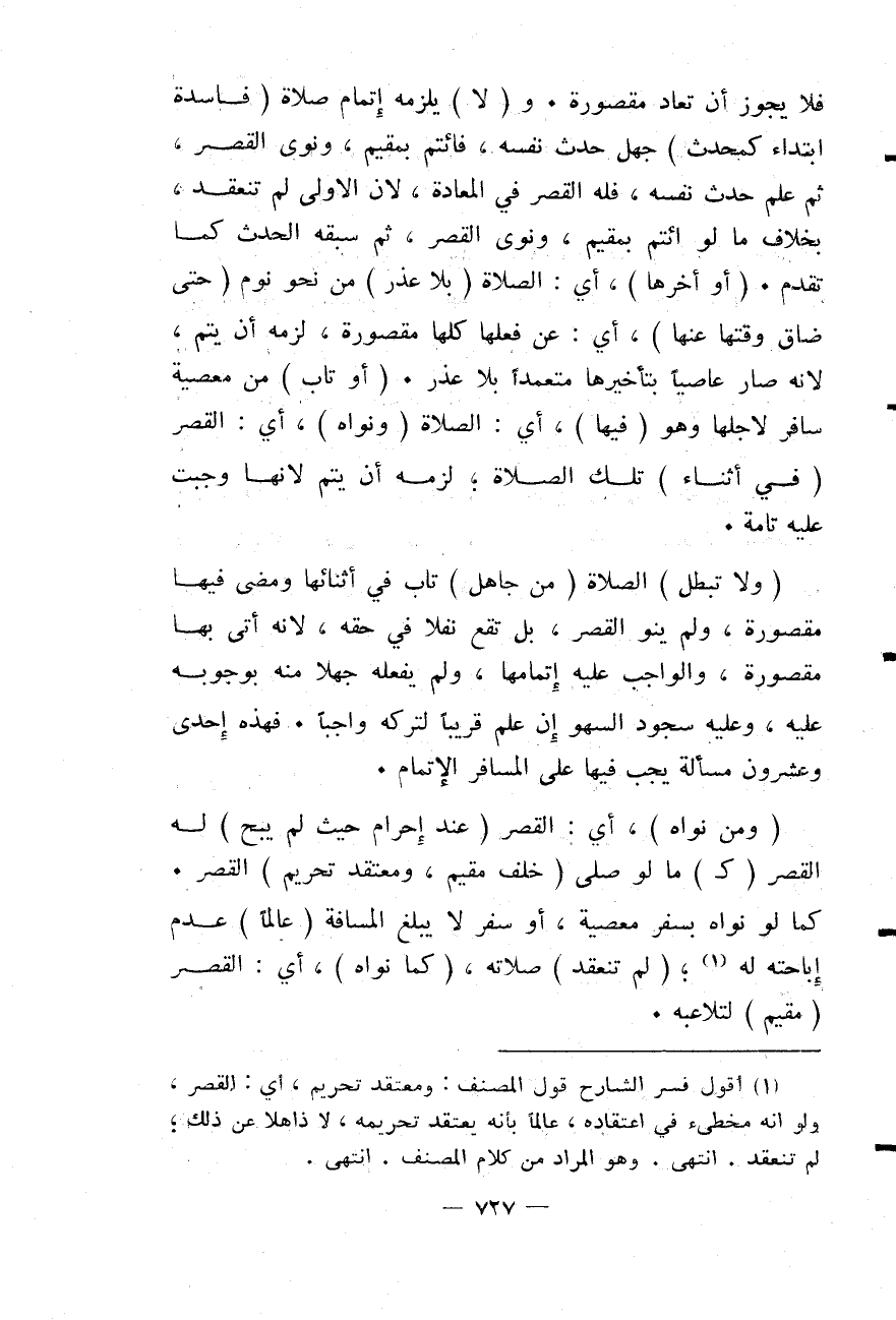 (أَوْ تَابَ) مِنْ مَعْصِيَةٍ سَافَرَ لِأَجْلِهَا وَهُوَ (فِيهَا) ، أَيْ الصَّلَاةِ (وَنَوَاهُ) ، أَيْ: الْقَصْرَ (فِي أَثْنَاءِ) تِلْكَ الصَّلَاةِ؛ لَزِمَهُ أَنْ يُتِمَّ؛ لِأَنَّهَا وَجَبَتْ عَلَيْهِ تَامَّةً. (وَلَا تَبْطُلُ) الصَّلَاةُ (مِنْ جَاهِلٍ) تَابَ فِي أَثْنَائِهَا وَمَضَى فِيهَا مَقْصُورَةً، وَلَمْ يَنْوِ الْقَصْرَ، بَلْ تَقَعُ نَفْلًا فِي حَقِّهِ، لِأَنَّهُ أَتَى بِهَا مَقْصُورَةً، وَالْوَاجِبُ عَلَيْهِ إتْمَامُهَا، وَلَمْ يَفْعَلْهُ جَهْلًا مِنْهُ بِوُجُوبِهِ عَلَيْهِ، وَعَلَيْهِ سُجُودُ السَّهْوِ إنْ عَلِمَ قَرِيبًا لِتَرْكِهِ وَاجِبًا.