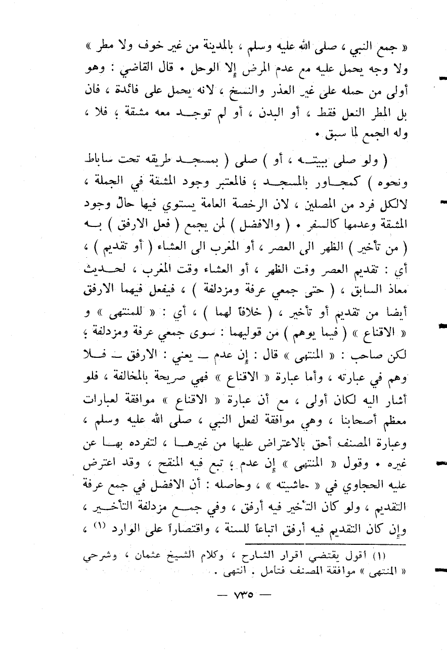 وَقَوْلُ " الْمُنْتَهَى " إنْ عُدِمَ؛ تَبِعَ فِيهِ الْمُنَقِّحَ، وَقَدْ اعْتَرَضَ عَلَيْهِ الْحَجَّاوِيُّ فِي حَاشِيَتِهِ " وَحَاصِلُهُ: أَنَّ الْأَفْضَلَ فِي جَمْعِ عَرَفَةَ التَّقْدِيمُ، وَلَوْ كَانَ التَّأْخِيرُ فِيهِ أَرْفَقُ، وَفِي جَمْعِ مُزْدَلِفَةَ التَّأْخِيرُ، وَإِنْ كَانَ التَّقْدِيمُ فِيهِ أَرْفَقَ اتِّبَاعًا لِلسُّنَّةِ، وَاقْتِصَارًا عَلَى الْوَارِدِ،