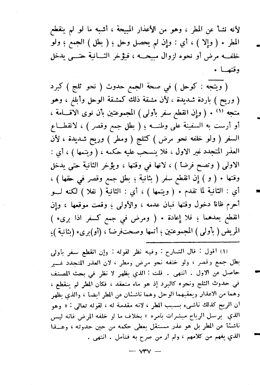 لِأَنَّهُ نَشَأَ عَنْ الْمَطَرِ، وَهُوَ مِنْ الْأَعْذَارِ الْمُبِيحَةِ، أَشْبَهَ مَا لَوْ لَمْ يَنْقَطِعْ الْمَطَرُ. (وَإِلَّا) ، أَيْ: وَإِنْ لَمْ يَحْصُلْ وَحَلَّ؛ (بَطَلَ) الْجَمْعُ؛ وَلَوْ خَلَّفَهُ مَرَضٌ أَوْ نَحْوُهُ لِزَوَالِ مُبِيحِهِ، فَيُؤَخِّرُ الثَّانِيَةَ حَتَّى يَدْخُلَ وَقْتُهَا. (وَيَتَّجِهُ: كَوَحَلٍ) فِي صِحَّةِ الْجَمْعِ حُدُوثُ (نَحْوِ ثَلْجٍ) كَبَرَدٍ (وَرِيحٍ) بَارِدَةٍ شَدِيدَةٍ؛ لِأَنَّ مَشَقَّةَ ذَلِكَ كَمَشَقَّةِ الْوَحَلِ وَأَبْلَغُ، وَهُوَ مُتَّجِهٌ.