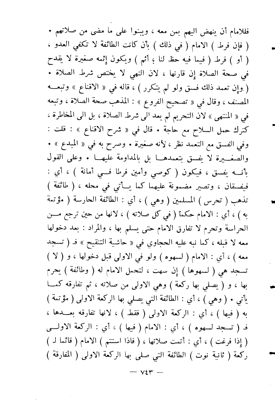 وَعَلَى الْقَوْلِ بِأَنَّهُ يَفْسُقُ، فَيَكُونُ (كَوَصِيٍّ وَأَمِينٍ فَرَّطَا فِي أَمَانَةٍ) ، أَيْ: فَيَفْسُقَانِ، وَتَصِيرُ مَضْمُونَةً عَلَيْهِمَا كَمَا يَأْتِي فِي مَحَلِّهِ، (طَائِفَةٌ) تَذْهَبُ (تَحْرُسُ) الْمُسْلِمِينَ (وَهِيَ) ، أَيْ: الطَّائِفَةُ الْحَارِسَةُ (مُؤْتَمَّةٌ بِهِ) ، أَيْ: الْإِمَامِ حُكْمًا (فِي كُلِّ صَلَاتِهِ) ؛ لِأَنَّهَا مِنْ حِينَ تَرْجِعُ مِنْ الْحِرَاسَةِ وَتُحْرِمُ لَا تُفَارِقُ الْإِمَامَ حَتَّى يُسَلِّمَ بِهَا، وَالْمُرَادُ: بَعْدَ دُخُولِهَا مَعَهُ لَا قَبْلَهُ، كَمَا نَبَّهَ عَلَيْهِ الْحَجَّاوِيُّ فِي حَاشِيَةِ التَّنْقِيحِ " فَ (تَسْجُدُ مَعَهُ) ، أَيْ: الْإِمَامِ (لِسَهْوِهِ) وَلَوْ فِي الْأُولَى قَبْلَ دُخُولِهَا، وَ (لَا) تَسْجُدُ هِيَ (لِسَهْوِهَا) إنْ سَهَتْ، لِتَحَمُّلِ الْإِمَامِ لَهُ (وَطَائِفَةٌ) يُحْرِمُ بِهَا، وَ (يُصَلِّي بِهَا رَكْعَةً) وَهِيَ الْأُولَى مِنْ صَلَاتِهِ، ثُمَّ تُفَارِقُهُ كَمَا يَأْتِي. (وَهِيَ) ، أَيْ: الطَّائِفَةُ الَّتِي يُصَلِّي بِهَا الرَّكْعَةَ الْأُولَى (مُؤْتَمَّةٌ) بِهِ (فِيهَا) ، أَيْ: الرَّكْعَةِ الْأُولَى (فَقَطْ) ؛ لِأَنَّهَا تُفَارِقُهُ بَعْدَهَا، فَ (تَسْجُدُ لِسَهْوِهِ) ، أَيْ: الْإِمَامِ (فِيهَا) ، أَيْ: الرَّكْعَةِ الْأُولَى (إذَا فَرَغَتْ) ، أَيْ: أَتَمَّتْ صَلَاتَهَا، (فَإِذَا اسْتَتَمَّ) الْإِمَامُ (قَائِمًا لِ) رَكْعَةٍ (ثَانِيَةٍ نَوَتْ) الطَّائِفَةُ الَّتِي صَلَّى بِهَا الرَّكْعَةَ الْأُولَى (الْمُفَارَقَةَ)