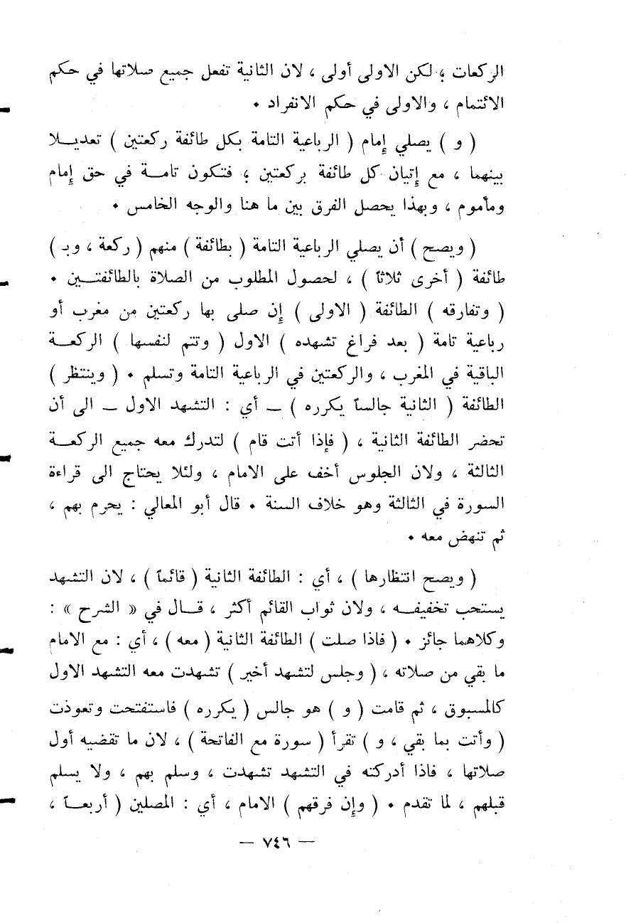 قَالَ أَبُو الْمَعَالِي: يُحْرِمُ بِهِمْ، ثُمَّ تَنْهَضُ مَعَهُ. (وَيَصِحُّ انْتِظَارُهَا) ، أَيْ: الطَّائِفَةِ الثَّانِيَةِ (قَائِمًا) ؛ لِأَنَّ التَّشَهُّدَ يُسْتَحَبُّ تَخْفِيفُهُ؛ وَلِأَنَّ ثَوَابَ الْقَائِمِ أَكْثَرُ، قَالَ فِي " الشَّرْحِ ": وَكِلَاهُمَا جَائِزٌ. (فَإِذَا صَلَّتْ) الطَّائِفَةُ الثَّانِيَةُ (مَعَهُ) ، أَيْ: مَعَ الْإِمَامِ مَا بَقِيَ مِنْ صَلَاتِهِ، (وَجَلَسَ لِتَشَهُّدٍ أَخِيرٍ) تَشَهَّدَتْ مَعَهُ التَّشَهُّدَ الْأَوَّلَ كَالْمَسْبُوقِ، ثُمَّ قَامَتْ (وَ) هُوَ جَالِسٌ (يُكَرِّرُهُ) فَاسْتَفْتَحَتْ وَتَعَوَّذَتْ (وَأَتَتْ بِمَا بَقِيَ، وَ) تَقْرَأُ (سُورَةً مَعَ الْفَاتِحَةِ) ؛ لِأَنَّ مَا تَقْضِيهِ أَوَّلُ صَلَاتِهَا، فَإِذَا أَدْرَكَتْهُ فِي التَّشَهُّدِ تَشَهَّدَتْ، وَسَلَّمَ بِهِمْ، وَلَا يُسَلِّمُ قَبْلَهُمْ، لِمَا تَقَدَّمَ. (وَإِنْ فَرَّقَهُمْ) الْإِمَامُ، أَيْ: الْمُصَلِّينَ (أَرْبَعًا،