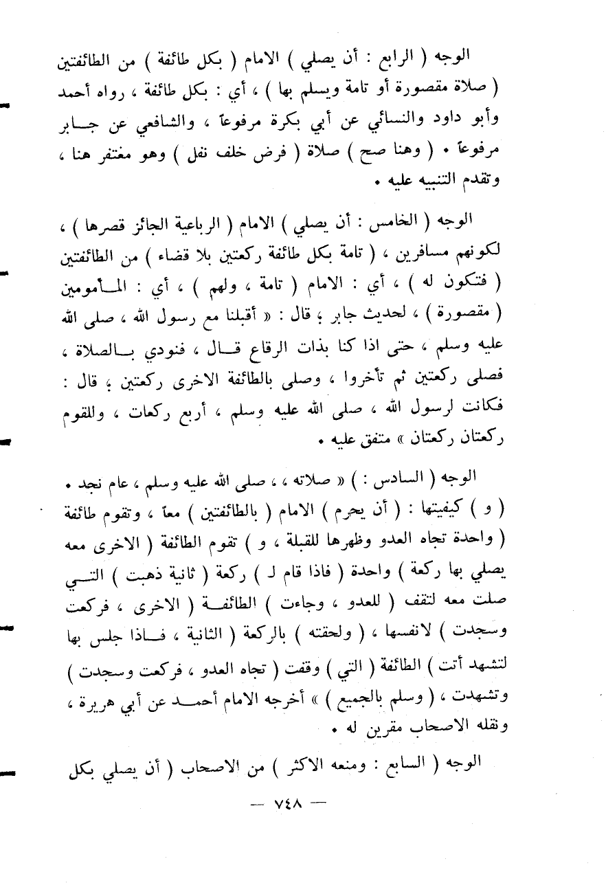 الْوَجْهُ (السَّادِسُ:) " صَلَاتُهُ - صَلَّى اللَّهُ عَلَيْهِ وَسَلَّمَ - عَامَ نَجْدٍ. (وَ) كَيْفِيَّتُهَا: (أَنْ يُحْرِمَ) الْإِمَامُ (بِالطَّائِفَتَيْنِ) مَعًا، وَتَقُومَ طَائِفَةٌ (وَاحِدَةٌ تِجَاهَ الْعَدُوِّ وَظُهْرُهَا لِلْقِبْلَةِ، وَ) تَقُومَ الطَّائِفَةُ (الْأُخْرَى مَعَهُ يُصَلِّي بِهَا رَكْعَةً) وَاحِدَةً (فَإِذَا قَامَ لِ) رَكْعَةٍ (ثَانِيَةٍ ذَهَبَتْ) الَّتِي صَلَّتْ مَعَهُ لِتَقِفَ (لِلْعَدُوِّ، وَجَاءَتْ) الطَّائِفَةُ (الْأُخْرَى، فَرَكَعَتْ وَسَجَدَتْ) لِأَنْفُسِهَا، (وَلَحِقَتْهُ) بِالرَّكْعَةِ (الثَّانِيَةِ، فَإِذَا جَلَسَ بِهَا لِتَشَهُّدٍ أَتَتْ) الطَّائِفَةُ (الَّتِي) وَقَفَتْ (تِجَاهَ الْعَدُوِّ، فَرَكَعَتْ وَسَجَدَتْ) وَتَشَهَّدَتْ، (وَسَلَّمَ بِالْجَمِيعِ) " أَخْرَجَهُ الْإِمَامُ أَحْمَدُ عَنْ أَبِي هُرَيْرَةَ، وَنَقَلَهُ الْأَصْحَابُ مُقِرِّينَ لَهُ.