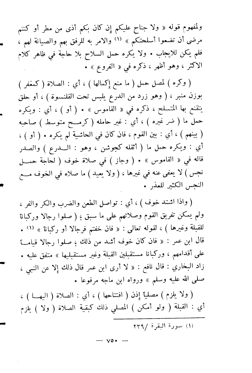 (وَجَازَ) فِي صَلَاةِ خَوْفٍ (لِحَاجَةٍ حَمْلُ نَجَسٍ) لَا يُعْفَى عَنْهُ فِي غَيْرِهَا، (وَلَا يُعِيدُ) مَا صَلَّاهُ فِي الْخَوْفِ مَعَ النَّجَسِ الْكَثِيرِ لِلْعُذْرِ. (وَإِذَا اشْتَدَّ خَوْفٌ) ، أَيْ: تَوَاصَلَ الطَّعْنُ وَالضَّرْبُ وَالْكَرُّ وَالْفَرُّ، وَلَمْ يُمْكِنْ تَفْرِيقُ الْقَوْمِ وَصَلَاتُهُمْ عَلَى مَا سَبَقَ، (صَلَّوْا رِجَالًا وَرُكْبَانًا لِلْقِبْلَةِ وَغَيْرِهَا) لِقَوْلِهِ تَعَالَى {فَإِنْ خِفْتُمْ فَرِجَالا أَوْ رُكْبَانًا} [البقرة: 239] .