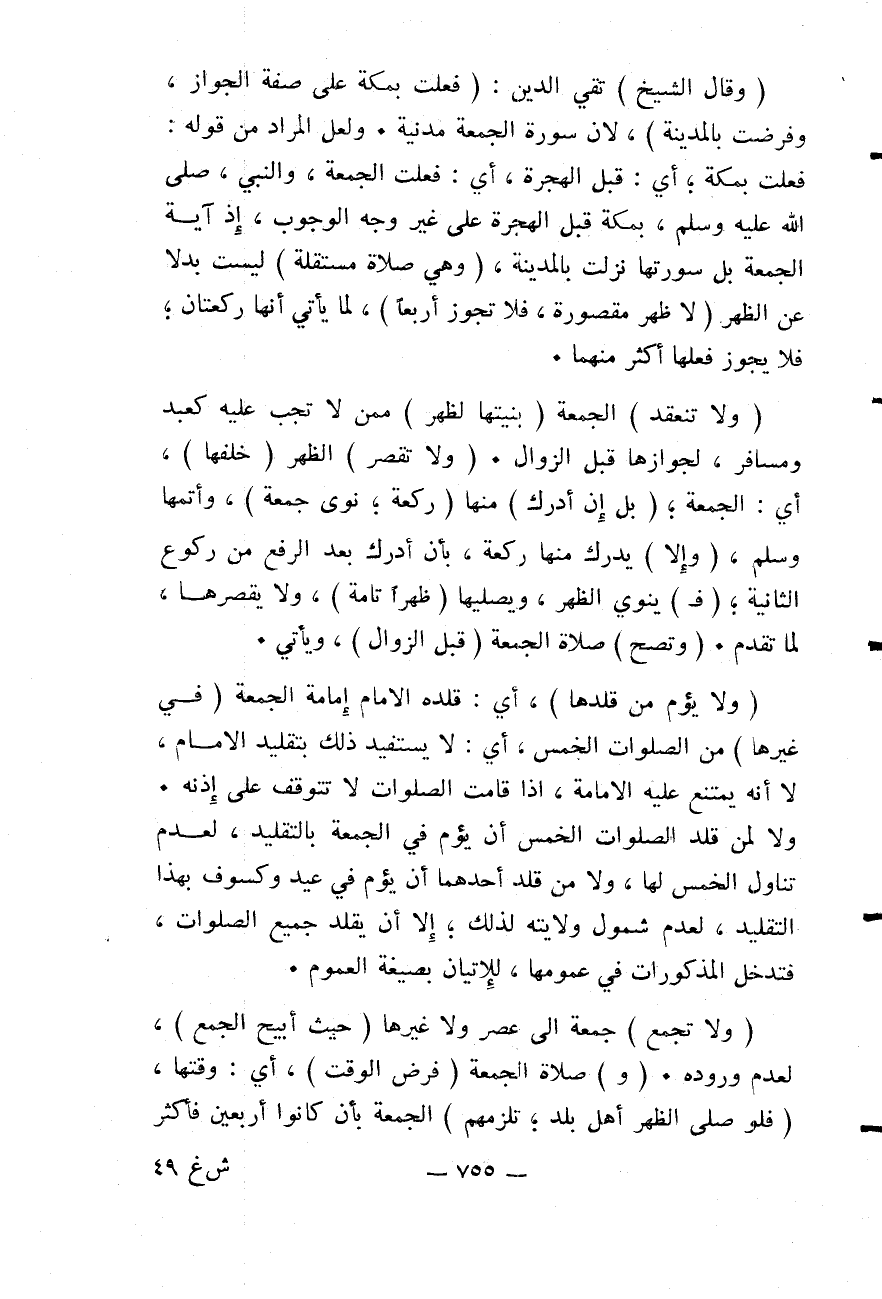 وَلَعَلَّ الْمُرَادَ مِنْ قَوْلِهِ: فُعِلَتْ بِمَكَّةَ، أَيْ: قَبْلَ الْهِجْرَةِ، أَيْ: فُعِلَتْ الْجُمُعَةُ، وَالنَّبِيُّ - صَلَّى اللَّهُ عَلَيْهِ وَسَلَّمَ - بِمَكَّةَ قَبْلَ الْهِجْرَةِ عَلَى غَيْرِ وَجْهِ الْوُجُوبِ، إذْ آيَةُ الْجُمُعَةِ بَلْ سُورَتُهَا نَزَلَتْ بِالْمَدِينَةِ، (وَهِيَ صَلَاةٌ مُسْتَقِلَّةٌ) لَيْسَتْ بَدَلًا عَنْ الظُّهْرِ (لَا ظُهْرَ مَقْصُورَةً، فَلَا تَجُوزُ أَرْبَعًا) ، لِمَا يَأْتِي أَنَّهَا رَكْعَتَانِ فَلَا يَجُوزُ فِعْلُهَا أَكْثَرَ مِنْهُمَا. (وَلَا تَنْعَقِدُ) الْجُمُعَةُ (بِنِيَّتِهَا لِظُهْرٍ) مِمَّنْ لَا تَجِبُ عَلَيْهِ كَعَبْدٍ وَمُسَافِرٍ، لِجَوَازِهَا قَبْلَ الزَّوَالِ. (وَلَا تُقْصَرُ) الظُّهْرُ (خَلْفَهَا) ، أَيْ: الْجُمُعَةِ، (بَلْ إنْ أَدْرَكَ) مِنْهَا (رَكْعَةً، نَوَى جُمُعَةً) ، وَأَتَمَّهَا وَسَلَّمَ، (وَإِلَّا) يُدْرِكُ مِنْهَا رَكْعَةً، بِأَنْ أَدْرَكَ بَعْدَ الرَّفْعِ مِنْ رُكُوعِ الثَّانِيَةِ، (فَ) يَنْوِي الظُّهْرَ، وَيُصَلِّيهَا (ظُهْرًا تَامَّةً) ، وَلَا يَقْصُرُهَا، لِمَا تَقَدَّمَ.