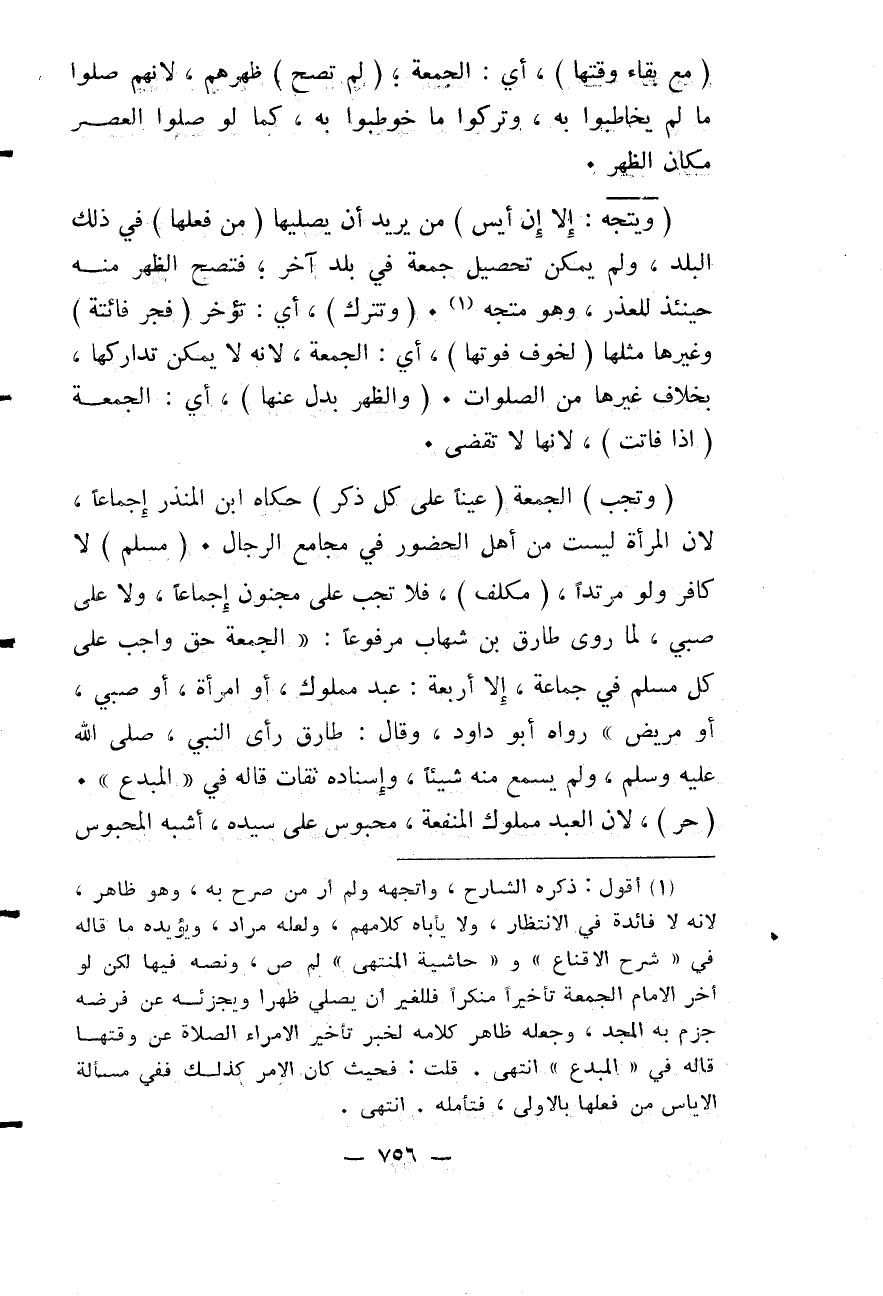(وَتَجِبُ) الْجُمُعَةُ (عَيْنًا عَلَى كُلِّ ذَكَرٍ) حَكَاهُ ابْنُ الْمُنْذِرِ إجْمَاعًا؛ لِأَنَّ الْمَرْأَةَ لَيْسَتْ مِنْ أَهْلِ الْحُضُورِ فِي مَجَامِعِ الرِّجَالِ (مُسْلِمٍ) لَا كَافِرٍ وَلَوْ مُرْتَدًّا، (مُكَلَّفٍ) ، فَلَا تَجِبُ عَلَى مَجْنُونٍ إجْمَاعًا، وَلَا عَلَى صَبِيٍّ، لِمَا رَوَى طَارِقُ بْنُ شِهَابٍ مَرْفُوعًا: «الْجُمُعَةُ حَقٌّ وَاجِبٌ عَلَى كُلِّ مُسْلِمٍ فِي جَمَاعَةٍ، إلَّا أَرْبَعَةً: عَبْدٌ مَمْلُوكٌ، أَوْ امْرَأَةٌ، أَوْ صَبِيٌّ، أَوْ مَرِيضٌ» رَوَاهُ أَبُو دَاوُد، وَقَالَ: طَارِقٌ رَأَى النَّبِيَّ - صَلَّى اللَّهُ عَلَيْهِ وَسَلَّمَ - وَلَمْ يَسْمَعْ مِنْهُ شَيْئًا، وَإِسْنَادُهُ ثِقَاتٌ قَالَهُ فِي " الْمُبْدِعِ ". (حُرٍّ) ؛ لِأَنَّ الْعَبْدَ مَمْلُوكُ الْمَنْفَعَةِ، مَحْبُوسٌ عَلَى سَيِّدِهِ، أَشْبَهَ الْمَحْبُوسَ