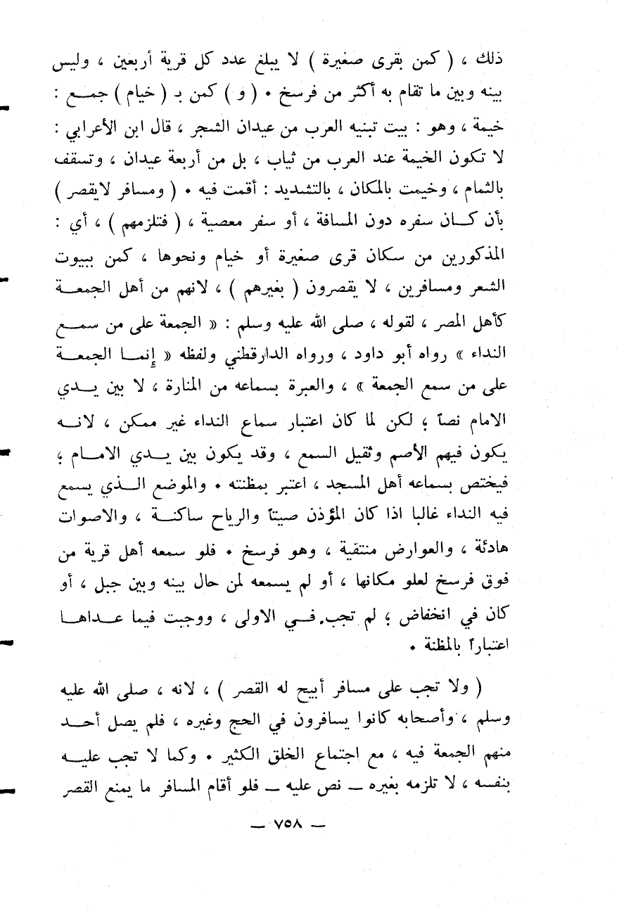ذَلِكَ، (كَمَنْ بِقُرَى صَغِيرَةٍ) لَا يَبْلُغُ عَدَدُ كُلِّ قَرْيَةٍ أَرْبَعِينَ، وَلَيْسَ بَيْنَهُ وَبَيْنَ مَا تُقَامُ بِهِ أَكْثَرُ مِنْ فَرْسَخٍ. (وَ) كَمَنْ بِ (خِيَامٍ) جَمْعُ: خَيْمَةٍ، وَهُوَ: بَيْتٌ تَبْنِيهِ الْعَرَبُ مِنْ عِيدَانِ الشَّجَرِ، قَالَ ابْنُ الْأَعْرَابِيِّ: لَا تَكُونُ الْخَيْمَةُ عِنْدَ الْعَرَبِ مِنْ ثِيَابٍ، بَلْ مِنْ أَرْبَعَةِ عِيدَانِ، وَتُسَقَّفُ بِالثُّمَامِ، وَخَيَّمْت بِالْمَكَانِ، بِالتَّشْدِيدِ: أَقَمْتَ فِيهِ. (وَمُسَافِرٍ لَا يَقْصُرُ) بِأَنْ كَانَ سَفَرُهُ دُونَ الْمَسَافَةِ، أَوْ سَفَرَ مَعْصِيَةٍ، (فَتَلْزَمُهُمْ) ، أَيْ: الْمَذْكُورِينَ مِنْ سُكَّانِ قُرَى صَغِيرَةٍ أَوْ خِيَامٍ وَنَحْوِهَا، كَمَنْ بِبُيُوتِ الشَّعْرِ وَمُسَافِرِينَ، لَا يَقْصُرُونَ (بِغَيْرِهِمْ) ؛ لِأَنَّهُمْ مِنْ أَهْلِ الْجُمُعَةِ كَأَهْلِ الْمِصْرِ، لِقَوْلِهِ - صَلَّى اللَّهُ عَلَيْهِ وَسَلَّمَ - «: الْجُمُعَةُ عَلَى مَنْ سَمِعَ النِّدَاءَ» رَوَاهُ أَبُو دَاوُد، وَرَوَاهُ الدَّارَقُطْنِيّ وَلَفْظُهُ «إنَّمَا الْجُمُعَةُ عَلَى مَنْ سَمِعَ الْجُمُعَةَ» ، وَالْعِبْرَةُ بِسَمَاعِهِ مِنْ الْمَنَارَةِ، لَا بَيْنَ يَدَيْ الْإِمَامِ نَصًّا، لَكِنْ لَمَّا كَانَ اعْتِبَارُ سَمَاعِ النِّدَاءِ غَيْرَ مُمْكِنٍ؛ لِأَنَّهُ يَكُونُ فِيهِمْ الْأَصَمُّ وَثَقِيلُ السَّمْعِ، وَقَدْ يَكُونُ بَيْنَ يَدَيْ الْإِمَامِ، فَيَخْتَصُّ بِسَمَاعِهِ أَهْلُ الْمَسْجِدِ، اُعْتُبِرَ بِمَظِنَّتِهِ.