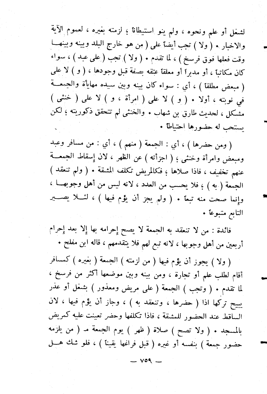 لِشُغْلٍ أَوْ عِلْمٍ وَنَحْوِهِ، وَلَمْ يَنْوِ اسْتِيطَانًا لَزِمَتْهُ بِغَيْرِهِ، لِعُمُومِ الْآيَةِ وَالْأَخْبَارِ (وَلَا) تَجِبُ أَيْضًا عَلَى (مَنْ هُوَ خَارِجُ الْبَلَدِ وَبَيْنَهُ وَبَيْنَهَا وَقْتَ فِعْلِهَا فَوْقَ فَرْسَخٍ) ، لِمَا تَقَدَّمَ. (وَلَا) تَجِبُ (عَلَى عَبْدٍ) ، سَوَاءٌ كَانَ مُكَاتَبًا، أَوْ مُدَبَّرًا أَوْ مُعَلِّقًا عِتْقَهُ بِصِفَةٍ قَبْلَ وُجُودِهَا، (وَ) لَا عَلَى (مُبَعَّضٍ مُطْلَقًا) ، أَيْ: سَوَاءٌ كَانَ بَيْنَهُ وَبَيْنَ سَيِّدِهِ مُهَايَأَةٌ وَالْجُمُعَةُ فِي نَوْبَتِهِ، أَوْ لَا. (وَ) لَا عَلَى (امْرَأَةٍ، وَ) لَا عَلَى (خُنْثَى) مُشْكِلٍ، لِحَدِيثِ طَارِقِ بْنِ شِهَابٍ.