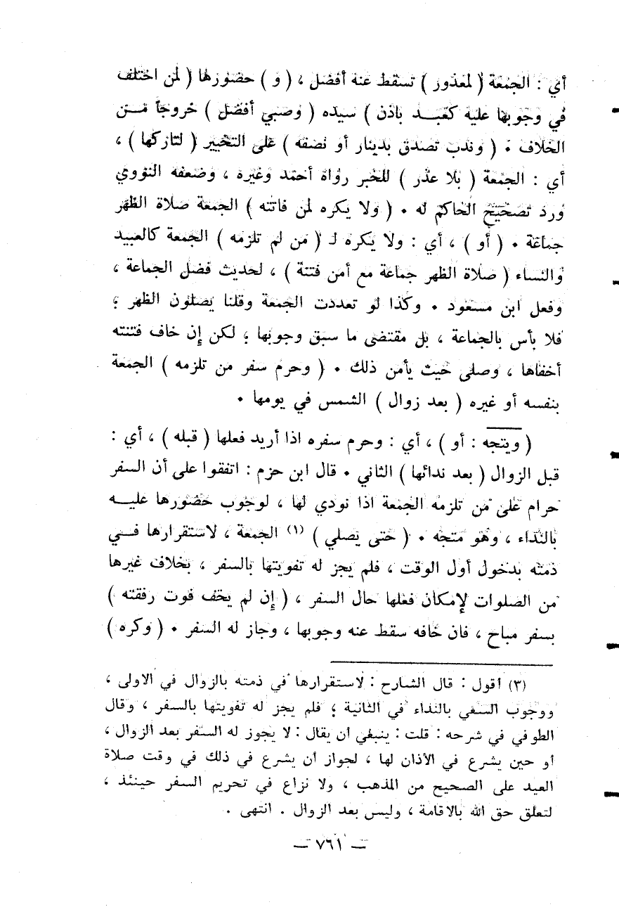 (وَحَرُمَ سَفَرُ مَنْ تَلْزَمُهُ) الْجُمُعَةُ بِنَفْسِهِ أَوْ غَيْرِهِ (بَعْدَ زَوَالِ) الشَّمْسِ فِي يَوْمِهَا. (وَيَتَّجِهُ: أَوْ) ، أَيْ: وَحَرُمَ سَفَرُهُ إذَا أُرِيدَ فِعْلُهَا (قَبْلَهُ) ، أَيْ: قَبْلَ الزَّوَالِ (بَعْدَ نِدَائِهَا) الثَّانِي قَالَ ابْنُ حَزْمٍ: اتَّفَقُوا عَلَى أَنَّ السَّفَرَ حَرَامٌ عَلَى مَنْ تَلْزَمُهُ الْجُمُعَةُ إذَا نُودِيَ لَهَا؛ لِوُجُوبِ حُضُورِهَا عَلَيْهِ بِالنِّدَاءِ، وَهُوَ مُتَّجِهٌ.
