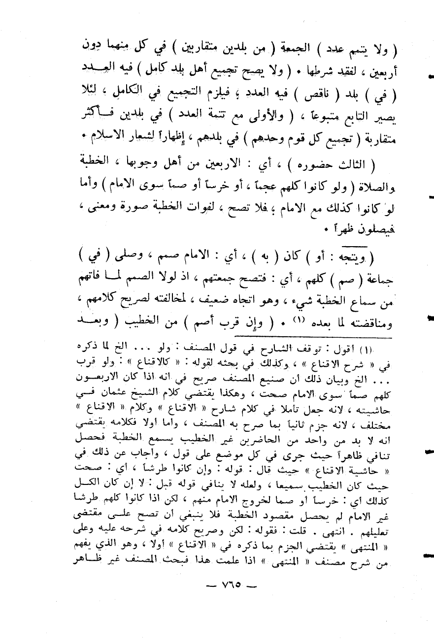 (الثَّالِثُ حُضُورُهُ) ، أَيْ: الْأَرْبَعِينَ مِنْ أَهْلِ وُجُوبِهَا، الْخُطْبَةَ وَالصَّلَاةَ (وَلَوْ كَانُوا كُلُّهُمْ عَجَمًا، أَوْ خُرْسًا أَوْ صُمًّا سِوَى الْإِمَامِ) وَأَمَّا لَوْ كَانُوا كَذَلِكَ مَعَ الْإِمَامِ، فَلَا تَصِحُّ، لِفَوَاتِ الْخُطْبَةِ صُورَةً وَمَعْنًى، فَيُصَلُّونَ ظُهْرًا (وَيَتَّجِهُ: أَوْ) كَانَ (بِهِ) ، أَيْ: الْإِمَامِ صَمَمٌ، وَصَلَّى (فِي) جَمَاعَةٍ (صُمٍّ) كُلِّهِمْ، أَيْ: فَتَصِحُّ جُمُعَتُهُمْ، إذْ لَوْلَا الصَّمَمُ لَمَا فَاتَهُمْ مِنْ سَمَاعِ الْخُطْبَةِ شَيْءٌ، وَهُوَ اتِّجَاهٌ ضَعِيفٌ، لِمُخَالَفَتِهِ لِصَرِيحِ كَلَامِهِمْ، وَمُنَاقَضَتِهِ لِمَا بَعْدَهُ.