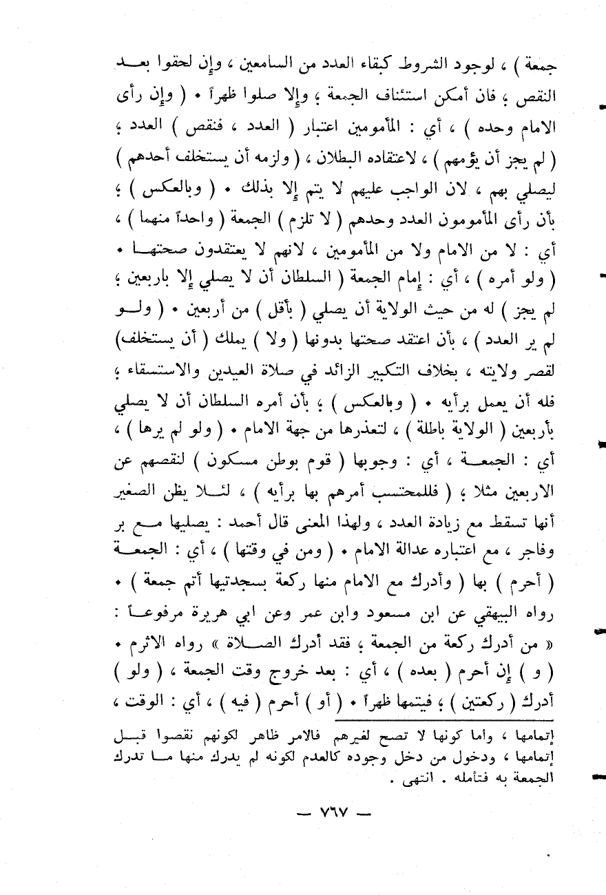 جُمُعَةً) ، لِوُجُودِ الشُّرُوطِ كَبَقَاءِ الْعَدَدِ مِنْ السَّامِعِينَ، وَإِنْ لَحِقُوا بَعْدَ النَّقْصِ، فَإِنْ أَمْكَنَ اسْتِئْنَافُ الْجُمُعَةِ، وَإِلَّا صَلَّوْا ظُهْرًا. (وَإِنْ رَأَى الْإِمَامُ وَحْدَهُ) ، أَيْ: الْمَأْمُومِينَ اعْتِبَارَ (الْعَدَدِ، فَنَقَصَ) الْعَدَدُ، (لَمْ يَجُزْ أَنْ يَؤُمَّهُمْ) ، لِاعْتِقَادِهِ الْبُطْلَانَ، (وَلَزِمَهُ أَنْ يَسْتَخْلِفَ أَحَدَهُمْ) لِيُصَلِّيَ بِهِمْ؛ لِأَنَّ الْوَاجِبَ عَلَيْهِمْ لَا يَتِمُّ إلَّا بِذَلِكَ. (وَبِالْعَكْسِ) ، بِأَنْ رَأَى الْمَأْمُومُونَ الْعَدَدَ وَحْدَهُمْ (لَا تَلْزَمُ) الْجُمُعَةُ (وَاحِدًا مِنْهُمَا) ، أَيْ: لَا مِنْ الْإِمَامِ وَلَا مِنْ الْمَأْمُومِينَ؛ لِأَنَّهُمْ لَا يَعْتَقِدُونَ صِحَّتَهَا.