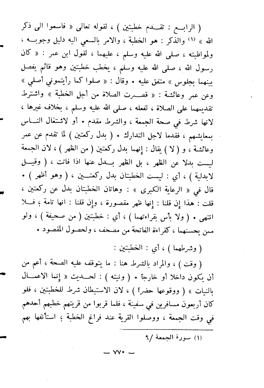 (الرَّابِعُ: تَقَدُّمُ خُطْبَتَيْنِ) لِقَوْلِهِ تَعَالَى {فَاسْعَوْا إِلَى ذِكْرِ اللَّهِ} [الجمعة: 9] : وَالذِّكْرُ: هُوَ الْخُطْبَةُ، وَالْأَمْرُ بِالسَّعْيِ إلَيْهِ دَلِيلُ وُجُوبِهِ.