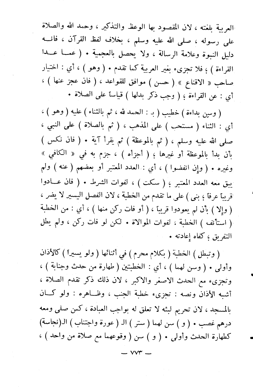 الْعَرَبِيَّةِ بِلُغَتِهِ؛ لِأَنَّ الْمَقْصُودَ بِهَا الْوَعْظُ وَالتَّذْكِيرُ، وَحَمْدُ اللَّهِ وَالصَّلَاةُ عَلَى رَسُولِهِ - صَلَّى اللَّهُ عَلَيْهِ وَسَلَّمَ - بِخِلَافِ لَفْظِ الْقُرْآنِ، فَإِنَّهُ دَلِيلُ النُّبُوَّةِ وَعَلَامَةُ الرِّسَالَةِ، وَلَا يَحْصُلُ بِالْعَجَمِيَّةِ. (عَمَّا عَدَا الْقِرَاءَةِ) ، فَلَا تُجْزِئُ بِغَيْرِ الْعَرَبِيَّةِ كَمَا تَقَدَّمَ. (وَهُوَ) ، أَيْ: اخْتِيَارُ صَاحِبِ " الْإِقْنَاعِ " (حَسَنٌ) مُوَافِقٌ لِلْقَوَاعِدِ، (فَإِنْ عَجَزَ عَنْهَا) ، أَيْ: عَنْ الْقِرَاءَةِ، (وَجَبَ ذِكْرُ بَدَلِهَا) قِيَاسًا عَلَى الصَّلَاةِ.