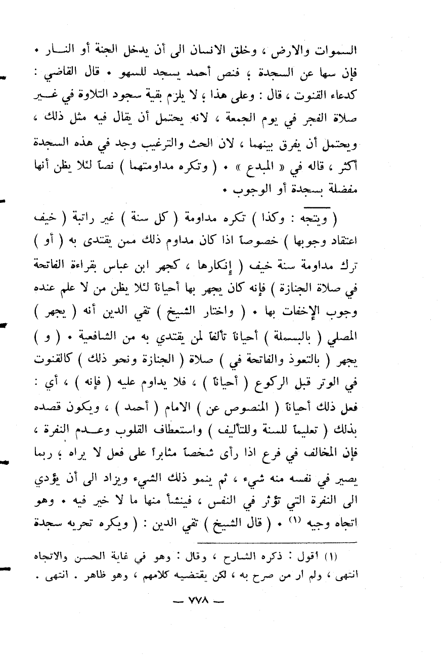 (وَتُكْرَهُ مُدَاوَمَتُهُمَا) نَصًّا لِئَلَّا يُظَنّ أَنَّهَا مُفَضَّلَةٌ بِسَجْدَةٍ أَوْ الْوُجُوبُ (وَيَتَّجِهُ: وَكَذَا) تُكْرَهُ مُدَاوَمَةُ (كُلِّ سُنَّةٍ) غَيْرِ رَاتِبَةٍ (خِيفَ اعْتِقَادُ وُجُوبِهَا) خُصُوصًا إذَا كَانَ مُدَاوِمُ ذَلِكَ مِمَّنْ يُقْتَدَى بِهِ (أَوْ) تَرْكُ مُدَاوَمَةِ سُنَّةٍ خِيفَ (إنْكَارُهَا، كَجَهْرِ ابْنِ عَبَّاسٍ بِقِرَاءَةِ الْفَاتِحَةِ فِي صَلَاةِ الْجِنَازَةِ) فَإِنَّهُ كَانَ يَجْهَرُ بِهَا أَحْيَانَا لِئَلَّا يَظُنَّ مَنْ لَا عِلْمَ عِنْدَهُ وُجُوبَ الْإِخْفَاتِ بِهَا. (وَاخْتَارَ الشَّيْخُ) تَقِيُّ الدِّينِ أَنَّهُ (يَجْهَرُ) الْمُصَلِّي (بِالْبَسْمَلَةِ) أَحْيَانَا تَأَلُّفًا لِمَنْ يَقْتَدِي بِهِ مِنْ الشَّافِعِيَّةِ. (وَ) يَجْهَرُ (بِالتَّعَوُّذِ وَالْفَاتِحَةِ فِي) صَلَاةِ (الْجِنَازَةِ وَنَحْوِ ذَلِكَ) كَالْقُنُوتِ فِي الْوَتْرِ قَبْلَ الرُّكُوعِ (أَحْيَانًا) ، فَلَا يُدَاوِمُ عَلَيْهِ (فَإِنَّهُ) ، أَيْ: فِعْلَ ذَلِكَ أَحْيَانًا (الْمَنْصُوصُ عَنْ) الْإِمَامِ (أَحْمَدَ) ، وَيَكُونُ قَصْدُهُ بِذَلِكَ (تَعْلِيمًا لِلسُّنَّةِ وَلِلتَّأْلِيفِ) وَاسْتِعْطَافِ الْقُلُوبِ وَعَدَمِ النَّفْرَةِ، فَإِنَّ الْمُخَالِفَ فِي فَرْعٍ إذَا رَأَى شَخْصًا مُثَابِرًا عَلَى فِعْلٍ لَا يَرَاهُ، رُبَّمَا يَصِيرُ فِي نَفْسِهِ مِنْهُ شَيْءٌ، ثُمَّ يَنْمُو ذَلِكَ الشَّيْءُ وَيُزَادُ إلَى أَنْ يُؤَدِّيَ إلَى النَّفْرَةِ الَّتِي تُؤَثِّرُ فِي النَّفْسِ، فَيَنْشَأُ مِنْهَا مَا لَا خَيْرَ فِيهِ.
