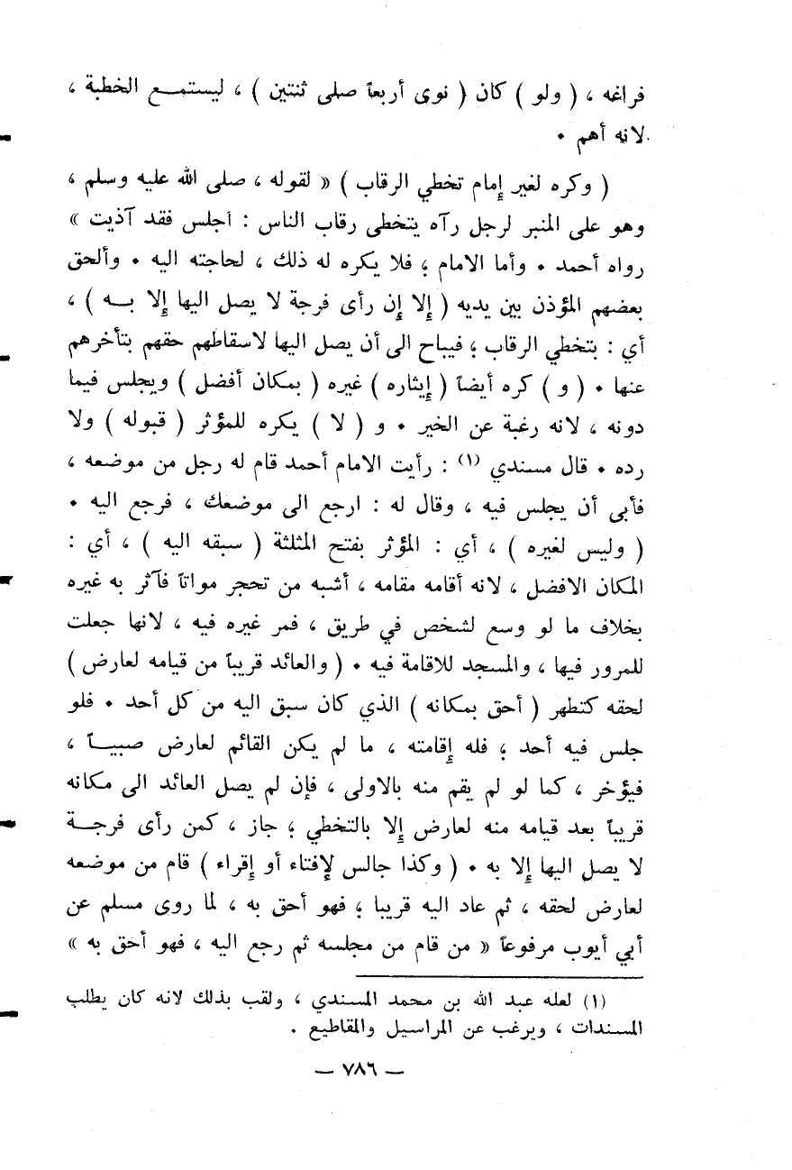 وَأَلْحَقَ بَعْضُهُمْ الْمُؤَذِّنَ بَيْنَ يَدَيْهِ (إلَّا إنْ رَأَى فُرْجَةً لَا يَصِلُ إلَيْهَا إلَّا بِهِ) ، أَيْ: بِتَخَطِّي الرِّقَابِ، فَيُبَاحُ إلَى أَنْ يَصِلَ إلَيْهَا لِإِسْقَاطِهِمْ حَقَّهُمْ بِتَأَخُّرِهِمْ عَنْهَا. (وَ) كُرِهَ أَيْضًا (إيثَارُهُ) غَيْرَهُ (بِمَكَانٍ أَفْضَلَ) وَيَجْلِسُ فِيمَا دُونَهُ؛ لِأَنَّهُ رَغْبَةٌ عَنْ الْخَيْرِ.