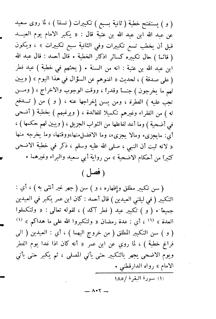 (فَصْلٌ) (سُنَّ تَكْبِيرٌ مُطْلَقٌ وَإِظْهَارُهُ، وَ) سُنَّ (جَهْرُ غَيْرِ أُنْثَى بِهِ) ، أَيْ: التَّكْبِيرِ (فِي لَيْلَتَيْ الْعِيدَيْنِ) قَالَ أَحْمَدُ: كَانَ ابْنُ عُمَرَ يُكَبِّرُ فِي الْعِيدَيْنِ جَمِيعًا. (وَ) تَكْبِيرُ عِيدِ (فِطْرٍ آكَدُ) ، لِقَوْلِهِ تَعَالَى: {وَلِتُكْمِلُوا الْعِدَّةَ} [البقرة: 185] ، أَيْ: عِدَّةَ رَمَضَانَ {وَلِتُكَبِّرُوا اللَّهَ عَلَى مَا هَدَاكُمْ} [البقرة: 185] (وَ) سُنَّ التَّكْبِيرُ الْمُطْلَقُ (مِنْ خُرُوجٍ إلَيْهِمَا) ، أَيْ: الْعِيدَيْنِ (إلَى فَرَاغِ خُطْبَةٍ) ، لِمَا رُوِيَ عَنْ ابْنِ عُمَرَ «أَنَّهُ كَانَ إذَا غَدَا يَوْمَ الْفِطْرِ وَيَوْمَ الْأَضْحَى يَجْهَرُ بِالتَّكْبِيرِ حَتَّى يَأْتِيَ الْمُصَلَّى، ثُمَّ يُكَبِّرُ حَتَّى يَأْتِيَ الْإِمَامُ» رَوَاهُ الدَّارَقُطْنِيّ