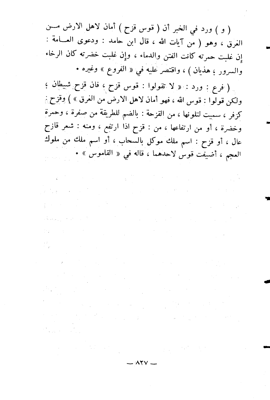 (وَ) وَرَدَ فِي الْخَبَرِ أَنَّ (قَوْسَ قُزَحَ) أَمَانٌ لِأَهْلِ الْأَرْضِ مِنْ الْغَرَقِ، وَهُوَ (مِنْ آيَاتِ اللَّهِ، قَالَ ابْنُ حَامِدٍ: وَدَعْوَى الْعَامَّةِ: إنْ غَلَبَتْ حُمْرَتُهُ كَانَتْ الْفِتَنُ وَالدِّمَاءُ، وَإِنْ غَلَبَتْ خُضْرَتُهُ كَانَ الرَّخَاءُ وَالسُّرُورُ، هَذَيَانٌ) ، وَاقْتَصَرَ عَلَيْهِ فِي " الْفُرُوعِ " وَغَيْرِهِ. (فَرْعٌ: وَرَدَ: " لَا تَقُولُوا: قَوْسُ قُزَحَ، فَإِنَّ قُزَحَ شَيْطَانٌ، وَلَكِنْ قُولُوا: قَوْسُ اللَّهِ، فَهُوَ أَمَانٌ لِأَهْلِ الْأَرْضِ مِنْ الْغَرَقِ ") وَقُزَحُ: كَزُفَرَ، سُمِّيَتْ لِتَلَوُّنِهَا، مِنْ الْقُزْحَةِ: بِالضَّمِّ لِلطَّرِيقَةِ مِنْ صُفْرَةٍ، وَحُمْرَةٍ وَخُضْرَةٍ، أَوْ مِنْ ارْتِفَاعِهَا، مِنْ: قَزَحَ إذَا ارْتَفَعَ، وَمِنْهُ: شَعْرٌ قَازِحٌ عَالٍ، أَوْ قُزَحُ: اسْمُ مَلَكٍ مُوَكَّلٍ بِالسَّحَابِ، أَوْ اسْمُ مَلِكٍ مِنْ مُلُوكِ الْعَجَمِ، أُضِيفَتْ قَوْسُ لِأَحَدِهِمَا، قَالَهُ فِي " الْقَامُوسِ ".