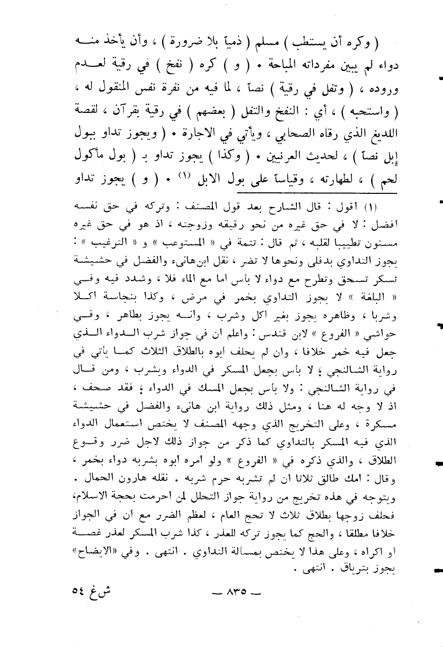 (وَيَجُوزُ تَدَاوٍ بِبَوْلِ إبِلٍ نَصًّا) ، لِحَدِيثِ الْعُرَنِيِّينَ. (وَكَذَا) يَجُوزُ تَدَاوٍ بِ (بَوْلِ مَأْكُولِ لَحْمٍ) ، لِطَهَارَتِهِ، وَقِيَاسًا عَلَى بَوْلِ الْإِبِلِ. (وَ) يَجُوزُ تَدَاوٍ