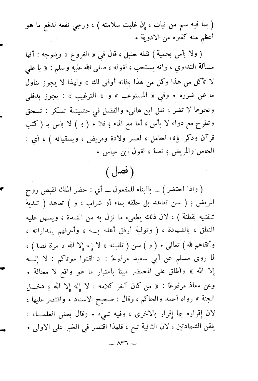 (فَصْلٌ) (وَإِذَا اُحْتُضِرَ) - بِالْبِنَاءِ لِلْمَفْعُولِ - أَيْ: حَضَرَ الْمَلَكُ لِقَبْضِ رُوحِ الْمَرِيضِ، (سُنَّ تَعَاهُدُ بَلِّ حَلْقِهِ بِمَاءٍ أَوْ شَرَابٍ، وَ) تَعَاهُدُ (تَنْدِيَةِ شَفَتَيْهِ بِقُطْنَةٍ) ؛ لِأَنَّ ذَلِكَ يُطْفِئُ مَا نَزَلَ بِهِ مِنْ الشِّدَّةِ، وَيُسَهِّلُ عَلَيْهِ النُّطْقَ، بِالشَّهَادَةِ، (وَتَوْلِيَةُ أَرْفَقِ أَهْلِهِ بِهِ، وَأَعْرَفِهِمْ بِمُدَارَاتِهِ، وَأَتْقَاهُمْ لِلَّهِ) تَعَالَى. (وَ) سُنَّ (تَلْقِينُهُ " لَا إلَهَ إلَّا اللَّهُ " مَرَّةً نَصًّا) ، لِمَا رَوَى مُسْلِمٌ عَنْ أَبِي سَعِيدٍ مَرْفُوعًا: «لَقِّنُوا مَوْتَاكُمْ: لَا إلَهَ إلَّا اللَّهُ» وَأُطْلِقَ عَلَى الْمُحْتَضَرِ مَيِّتًا بِاعْتِبَارِ مَا هُوَ وَاقِعٌ لَا مَحَالَةَ.