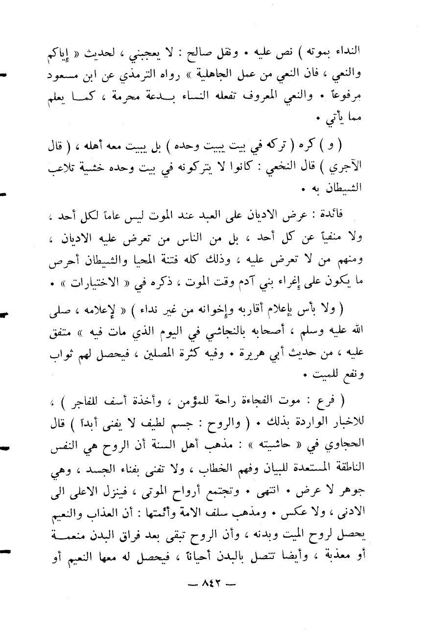 (وَالرُّوحُ: جِسْمٌ لَطِيفٌ لَا يَفْنَى أَبَدًا) قَالَ الْحَجَّاوِيُّ فِي حَاشِيَتِهِ ": مَذْهَبُ أَهْلِ السُّنَّةِ أَنَّ الرُّوحَ هِيَ النَّفْسُ النَّاطِقَةُ الْمُسْتَعِدَّةُ لِلْبَيَانِ وَفَهْمِ الْخِطَابِ، وَلَا تَفْنَى بِفَنَاءِ الْجَسَدِ، وَهِيَ جَوْهَرٌ لَا عَرَضٌ. انْتَهَى.