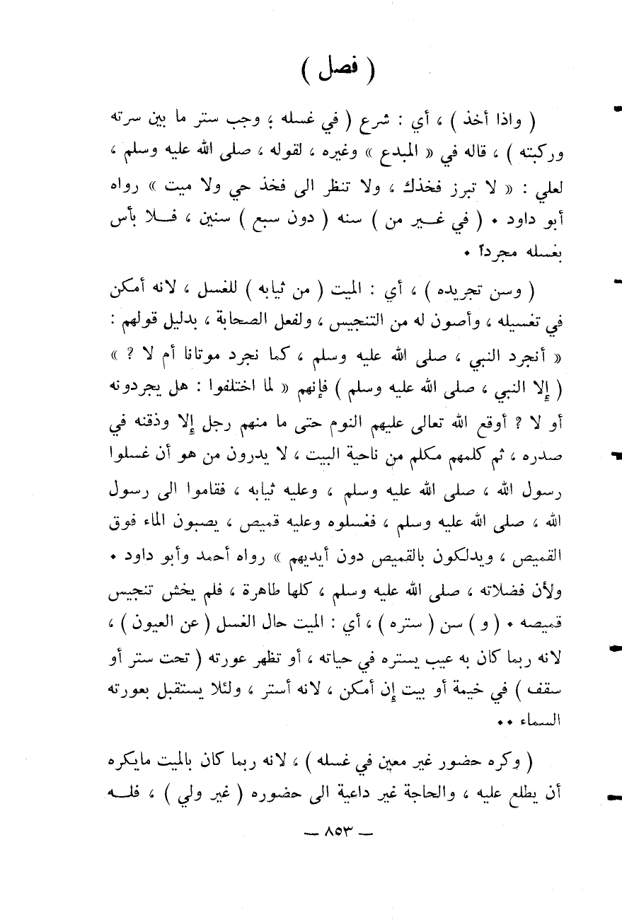 (فَصْلٌ) (وَإِذَا أُخِذَ) ، أَيْ: شُرِعَ (فِي غُسْلِهِ؛ وَجَبَ سَتْرُ مَا بَيْنَ سُرَّتِهِ وَرُكْبَتِهِ) ، قَالَهُ فِي " الْمُبْدِعِ " وَغَيْرِهِ، لِقَوْلِهِ - صَلَّى اللَّهُ عَلَيْهِ وَسَلَّمَ - لِعَلِيٍّ: «لَا تُبْرِزْ فَخِذَكَ، وَلَا تَنْظُرْ إلَى فَخِذِ حَيٍّ وَلَا مَيِّتٍ» رَوَاهُ أَبُو دَاوُد. (فِي غَيْرِ مَنْ) سِنُّهُ (دُونَ سَبْعِ) سِنِينَ، فَلَا بَأْسَ بِغُسْلِهِ مُجَرَّدًا. (وَسُنَّ تَجْرِيدُهُ) ، أَيْ: الْمَيِّتِ (مِنْ ثِيَابِهِ) لِلْغُسْلِ.
