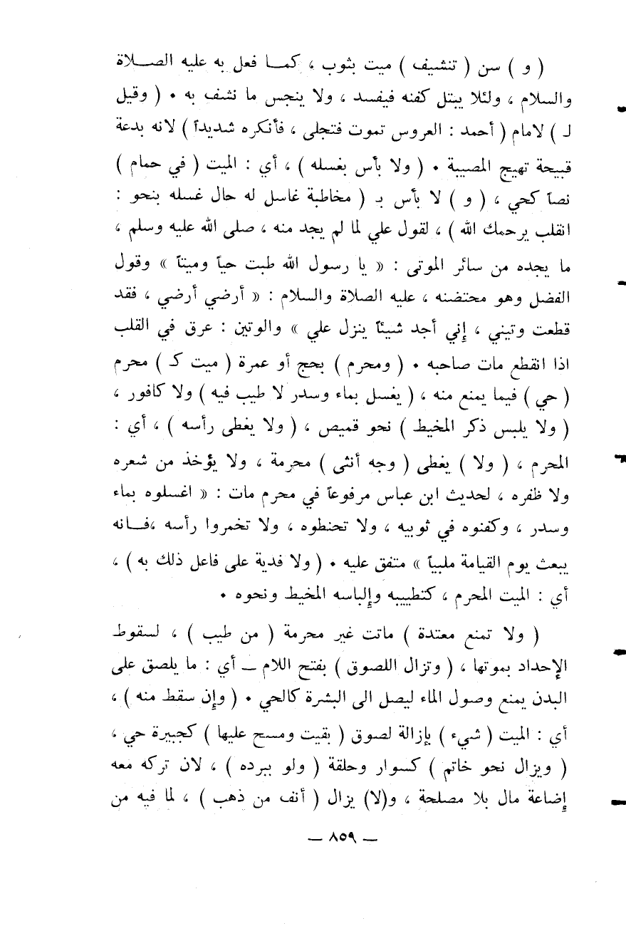 (وَمُحْرِمٌ) بِحَجٍّ أَوْ عُمْرَةٍ (مَيِّتٌ كَ) مُحْرِمٍ (حَيٍّ) فِيمَا يُمْنَعُ مِنْهُ، (يُغَسَّلُ بِمَاءٍ وَسِدْرٍ لَا طِيبَ فِيهِ) وَلَا كَافُورَ، (وَلَا يَلْبَسُ ذَكَرٌ الْمِخْيَطَ) نَحْوَ قَمِيصٍ، (وَلَا يُغَطَّى رَأْسُهُ) ، أَيْ: الْمُحْرِمِ، (وَلَا) يُغَطَّى (وَجْهُ أُنْثَى) مُحْرِمَةٍ، وَلَا يُؤْخَذُ مِنْ شَعْرِهِ وَلَا ظُفْرِهِ، لِحَدِيثِ ابْنِ عَبَّاسٍ مَرْفُوعًا فِي مُحْرِمٍ مَاتَ: «اغْسِلُوهُ بِمَاءٍ وَسِدْرٍ، وَكَفِّنُوهُ فِي ثَوْبَيْهِ، وَلَا تُحَنِّطُوهُ، وَلَا تُخَمِّرُوا رَأْسَهُ، فَإِنَّهُ يُبْعَثُ يَوْمَ الْقِيَامَةِ مُلَبِّيًا» مُتَّفَقٌ عَلَيْهِ. (وَلَا فِدْيَةَ عَلَى فَاعِلِ ذَلِكَ بِهِ) .