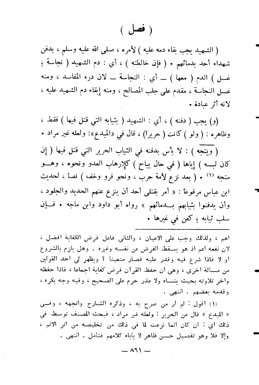(وَ) يَجِبُ (دَفْنُهُ) ، أَيْ: الشَّهِيدِ (بِثِيَابِهِ الَّتِي قُتِلَ فِيهَا) فَقَطْ، وَظَاهِرُهُ: (وَلَوْ) كَانَتْ (حَرِيرًا) ، قَالَ فِي " الْمُبْدِعِ ": وَلَعَلَّهُ غَيْرُ مُرَادٍ. (وَيَتَّجِهُ) : لَا بَأْسَ بِدَفْنِهِ فِي الثِّيَابِ الْحَرِيرِ الَّتِي قُتِلَ فِيهَا، (إنْ كَانَ لُبْسُهُ) إيَّاهَا (فِي حَالٍ يُبَاحُ) كَإِرْهَابِ الْعَدُوِّ وَنَحْوِهِ، وَهُوَ مُتَّجِهٌ. (بَعْدَ نَزْعٍ لَأْمَةِ حَرْبٍ، وَنَحْوِ فَرْوٍ وَخُفٍّ) نَصًّا، لِحَدِيثِ ابْنِ عَبَّاسٍ مَرْفُوعًا: «أُمِرَ بِقَتْلَى أُحُدٍ أَنْ يُنْزَعَ عَنْهُمْ الْحَدِيدُ وَالْجُلُودُ، وَأَنْ يُدْفَنُوا بِثِيَابِهِمْ بِدِمَائِهِمْ» رَوَاهُ أَبُو دَاوُد وَابْنُ مَاجَهْ.