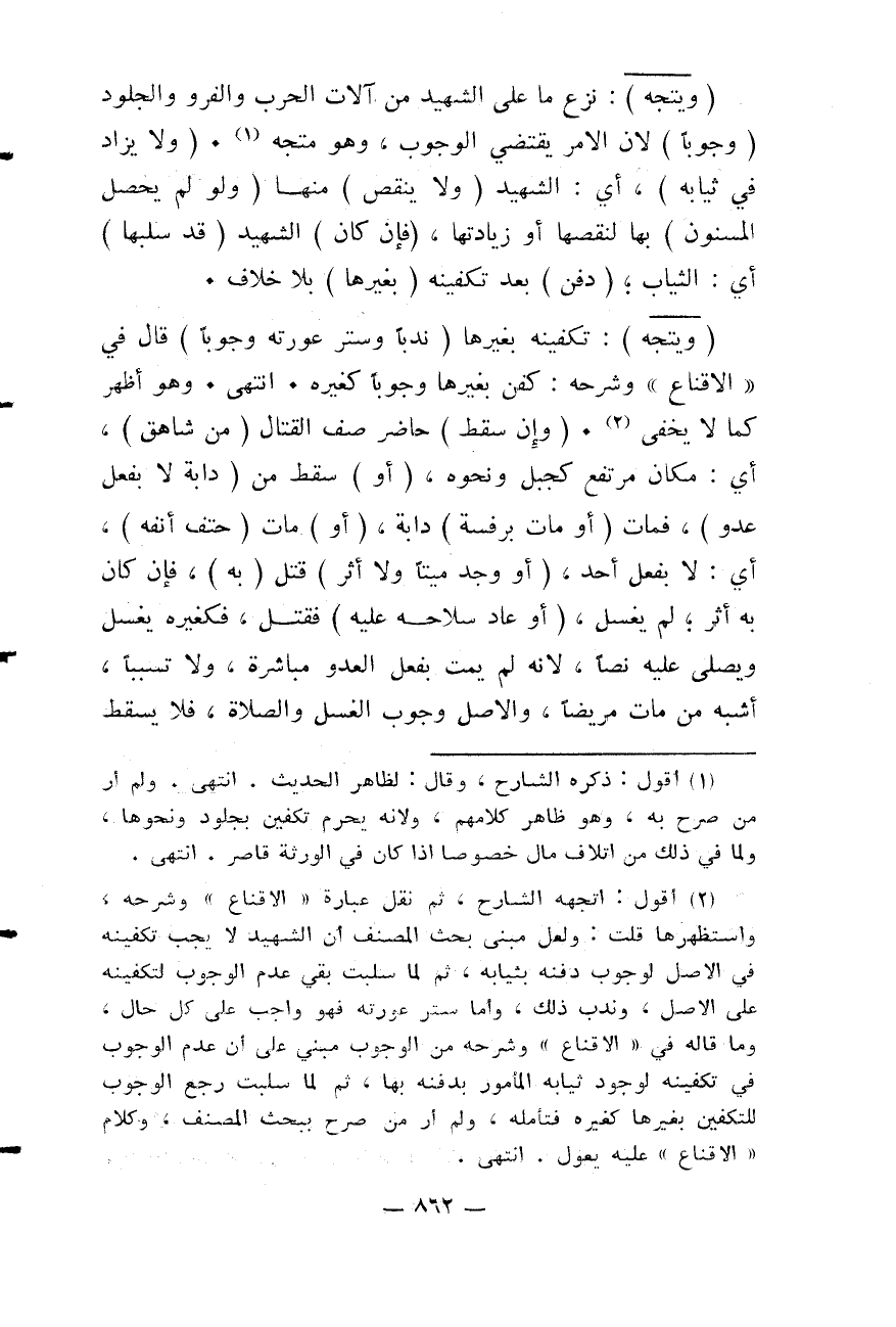 وَهُوَ مُتَّجِهٌ. (وَلَا يُزَادُ فِي ثِيَابِهِ) ، أَيْ: الشَّهِيدِ (وَلَا يُنْقَصُ) مِنْهَا (وَلَوْ لَمْ يَحْصُلُ الْمَسْنُونُ) بِهَا لِنَقْصِهَا أَوْ زِيَادَتِهَا، (فَإِنْ كَانَ) الشَّهِيدُ (قَدْ سَلَبَهَا) أَيْ: الثِّيَابَ (دُفِنَ) بَعْدَ تَكْفِينِهِ (بِغَيْرِهَا) بِلَا خِلَافٍ. (وَيَتَّجِهُ) : تَكْفِينُهُ بِغَيْرِهَا (نَدْبًا، وَسِتْرُ عَوْرَتِهِ وُجُوبًا) قَالَ فِي " الْإِقْنَاعِ " وَشَرْحِهِ: كُفِّنَ بِغَيْرِهَا وُجُوبًا كَغَيْرِهِ.