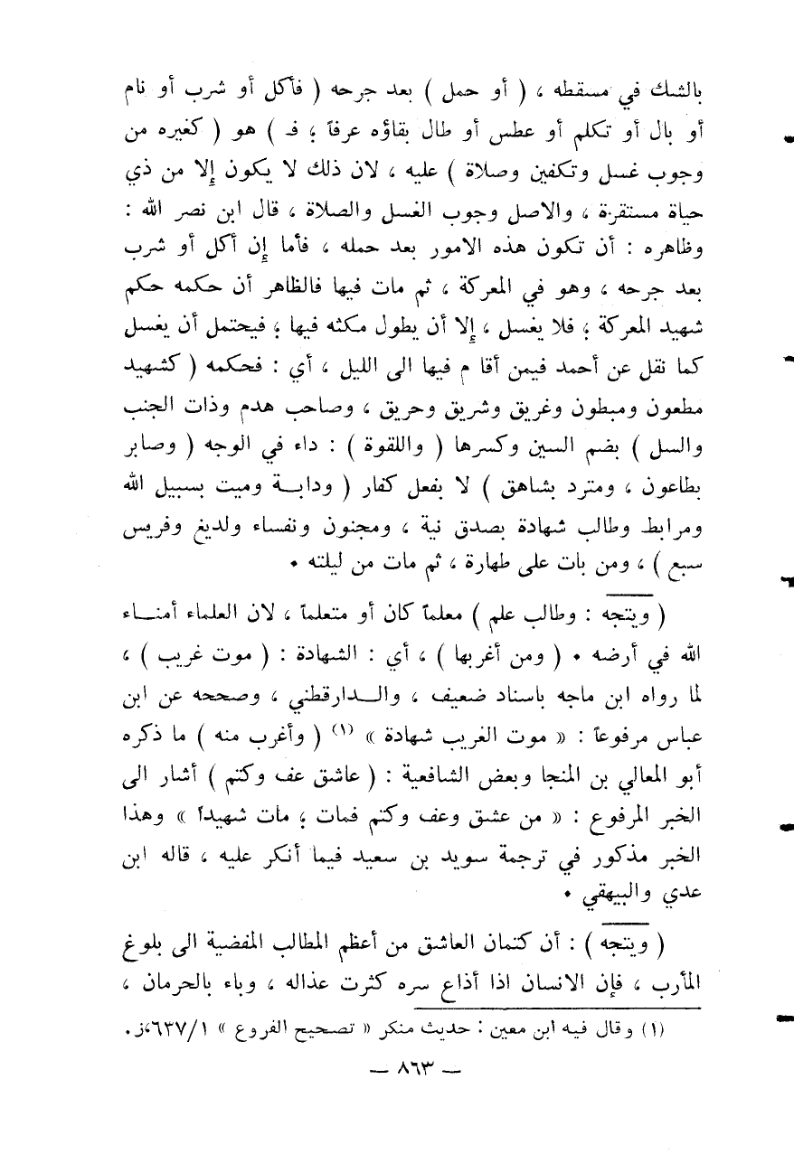 بِالشَّكِّ فِي مَسْقَطِهِ. (أَوْ حُمِلَ) بَعْدَ جُرْحِهِ (فَأَكَلَ أَوْ شَرِبَ أَوْ نَامَ أَوْ بَالَ أَوْ تَكَلَّمَ أَوْ عَطَسَ أَوْ طَالَ بَقَاؤُهُ عُرْفًا؛ فَ) هُوَ (كَغَيْرِهِ مِنْ وُجُوبِ غُسْلٍ وَتَكْفِينٍ وَصَلَاةٍ) عَلَيْهِ؛ لِأَنَّ ذَلِكَ لَا يَكُونُ إلَّا مِنْ ذِي حَيَاةٍ مُسْتَقِرَّةٍ، وَالْأَصْلُ وُجُوبُ الْغُسْلِ وَالصَّلَاةِ، قَالَ ابْنُ نَصْرِ اللَّهِ: وَظَاهِرُهُ: أَنْ تَكُونَ هَذِهِ الْأُمُورُ بَعْدَ حَمْلِهِ، فَأَمَّا إنْ أَكَلَ أَوْ شَرِبَ بَعْدَ جُرْحِهِ، وَهُوَ فِي الْمَعْرَكَةِ، ثُمَّ مَاتَ فِيهَا، فَالظَّاهِرُ أَنَّ حُكْمَهُ حُكْمُ شَهِيدِ الْمَعْرَكَةِ، فَلَا يُغَسَّلُ، إلَّا أَنْ يَطُولَ مُكْثُهُ فِيهَا؛ فَيُحْتَمَلُ أَنْ يُغَسَّلَ كَمَا نُقِلَ عَنْ أَحْمَدَ فِيمَنْ أَقَامَ فِيهَا إلَى اللَّيْلِ، أَيْ: فَحُكْمُهُ (كَشَهِيدٍ مَطْعُونٍ وَمَبْطُونٍ وَغَرِيقٍ وَشَرِيقٍ وَحَرِيقٍ وَصَاحِبِ هَدْمٍ وَذَاتِ الْجَنْبِ وَالسُّلِّ) بِضَمِّ السِّين وَكَسْرِهَا (وَاللَّقْوَةِ) : دَاءٌ فِي الْوَجْهِ (وَصَابِرٍ بِطَاعُونٍ، وَمُتَرَدٍّ بِشَاهِقٍ) لَا بِفِعْلِ كُفَّارٍ (وَدَابَّةٍ وَمَيِّتٍ بِسَبِيلِ اللَّهِ، وَمُرَابِطٍ وَطَالِبِ شَهَادَةٍ بِصِدْقِ نِيَّةٍ، وَمَجْنُونٍ وَنُفَسَاءَ وَلَدِيغٍ وَفَرِيسِ سَبُعٍ) ، وَمَنْ بَاتَ عَلَى طَهَارَةٍ، ثُمَّ مَاتَ مِنْ لَيْلَتِهِ. (وَيَتَّجِهُ: وَطَالِبُ عِلْمٍ) مُعَلِّمًا كَانَ أَوْ مُتَعَلِّمًا؛ لِأَنَّ الْعُلَمَاءَ أُمَنَاءُ اللَّهِ فِي أَرْضِهِ.