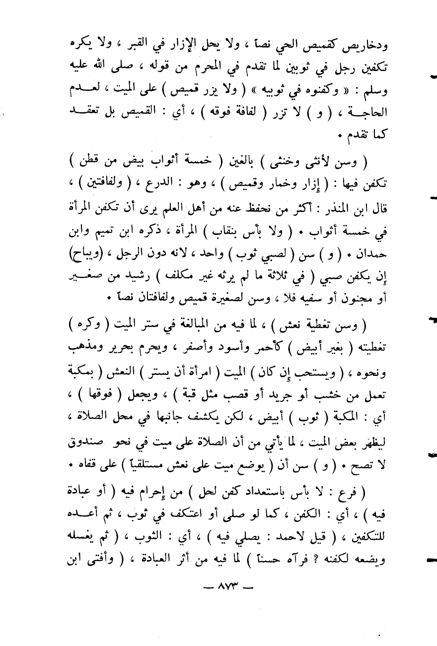 (وَسُنَّ لِأُنْثَى وَخُنْثَى) بَالِغَيْنِ (خَمْسَةُ أَثْوَابٍ بِيضٍ مِنْ قُطْنٍ) تُكَفَّنُ فِيهَا: (إزَارٍ وَخِمَارٍ وَقَمِيصٍ) ، وَهُوَ: الدِّرْعُ، (وَلِفَافَتَيْنِ) ، قَالَ ابْنُ الْمُنْذِرِ: أَكْثَرُ مَنْ نَحْفَظُ عَنْهُ مِنْ أَهْلِ الْعِلْمِ يَرَى أَنْ تُكَفَّنَ الْمَرْأَةُ فِي خَمْسَةِ أَثْوَابٍ. (وَلَا بَأْسَ بِنِقَابِ) الْمَرْأَةِ، ذَكَرَهُ ابْنُ تَمِيمٍ وَابْنُ حَمْدَانَ