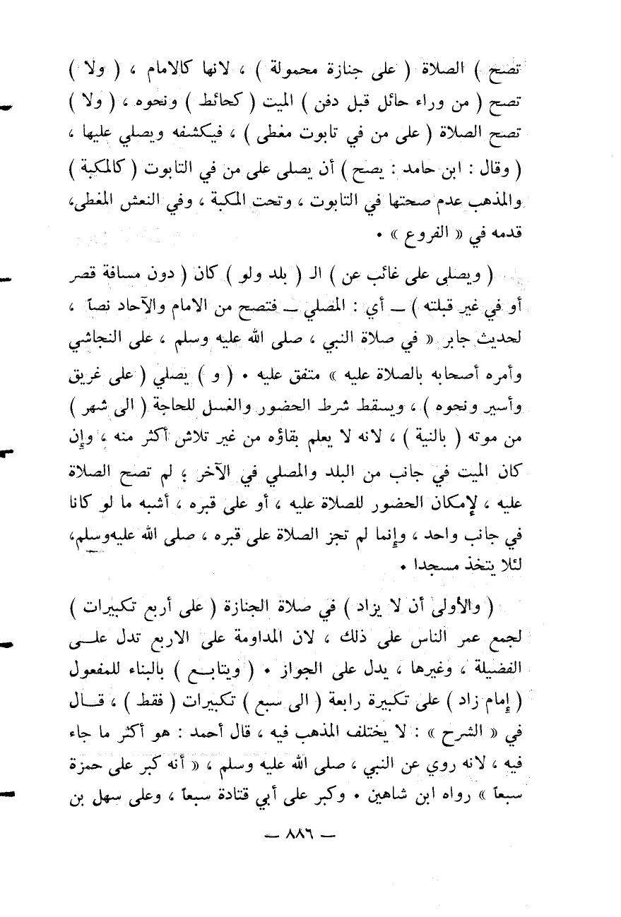 تَصِحُّ) الصَّلَاةُ (عَلَى جِنَازَةٍ مَحْمُولَةٍ) ؛ لِأَنَّهَا كَالْإِمَامِ، (وَلَا) تَصِحُّ (مِنْ وَرَاءَ حَائِلٍ قَبْلَ دَفْنِ) الْمَيِّتِ (كَحَائِطٍ) وَنَحْوِهِ، (وَلَا) تَصِحُّ الصَّلَاةُ (عَلَى مَنْ فِي تَابُوتٍ مُغَطًّى) ، فَيَكْشِفُهُ وَيُصَلِّي عَلَيْهَا، (وَقَالَ: ابْنُ حَامِدٍ: يَصِحُّ) أَنْ يُصَلَّى عَلَى مَنْ فِي التَّابُوتِ (كَالْمُكِبَّةِ) وَالْمَذْهَبُ عَدَمُ صِحَّتِهَا فِي التَّابُوتِ، وَتَحْتَ الْمُكِبَّةِ، وَفِي النَّعْشِ الْمُغَطَّى، قَدَّمَهُ فِي " الْفُرُوعِ ".