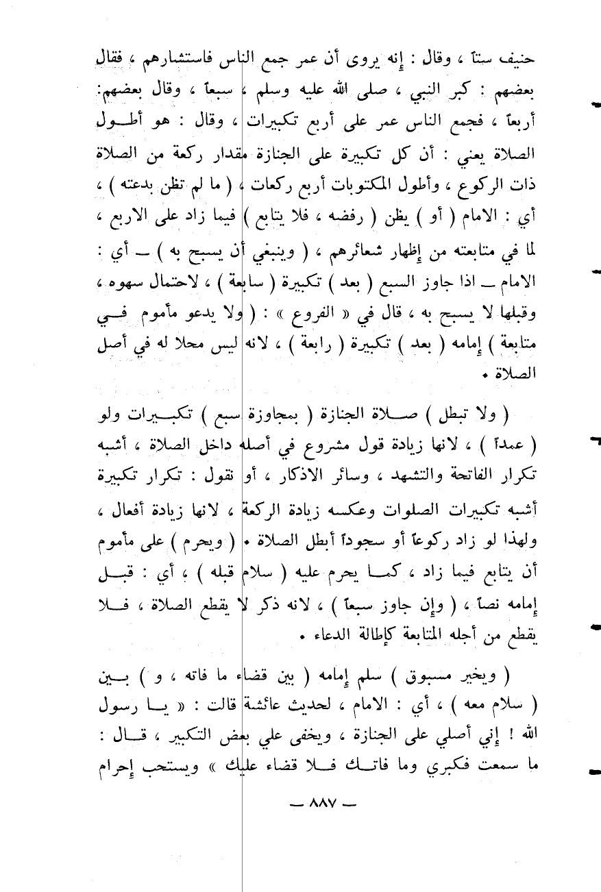 سِتًّا» ، وَقَالَ: إنَّهُ يُرْوَى أَنَّ عُمَرَ جَمَعَ النَّاسَ فَاسْتَشَارَهُمْ، فَقَالَ بَعْضُهُمْ: كَبَّرَ النَّبِيُّ - صَلَّى اللَّهُ عَلَيْهِ وَسَلَّمَ - سَبْعًا، وَقَالَ بَعْضُهُمْ: أَرْبَعًا، فَجَمَعَ النَّاسَ عُمَرُ عَلَى أَرْبَعِ تَكْبِيرَاتٍ، وَقَالَ: هُوَ أَطْوَلُ الصَّلَاةِ يَعْنِي: أَنَّ كُلَّ تَكْبِيرَةٍ عَلَى الْجِنَازَةِ مِقْدَارُ رَكْعَةٍ مِنْ الصَّلَاةِ ذَاتِ الرُّكُوعِ، وَأَطْوَلُ الْمَكْتُوبَاتِ أَرْبَعُ رَكَعَاتٍ، (مَا لَمْ تُظَنَّ بِدْعَتُهُ) ، أَيْ: الْإِمَامُ (أَوْ) يُظَنَّ (رَفْضُهُ، فَلَا يُتَابَعَ) فِيمَا زَادَ عَلَى الْأَرْبَعِ، لِمَا فِي مُتَابَعَتِهِ مِنْ إظْهَارِ شَعَائِرِهِمْ، (وَيَنْبَغِي أَنْ يُسَبَّحَ بِهِ) - أَيْ: الْإِمَامِ - إذَا جَاوَزَ السَّبْعَ (بَعْدَ) تَكْبِيرَةٍ (سَابِعَةٍ) ، لِاحْتِمَالِ سَهْوِهِ، وَقَبْلَهَا لَا يُسَبَّحُ بِهِ، قَالَ فِي " الْفُرُوعِ ": (وَلَا يَدْعُو مَأْمُومٌ فِي مُتَابَعَةِ) إمَامِهِ (بَعْدَ) تَكْبِيرَةٍ (رَابِعَةٍ) ؛ لِأَنَّهُ لَيْسَ مَحَلًّا لَهُ فِي أَصْلِ الصَّلَاةِ. (وَلَا تَبْطُلُ) صَلَاةُ الْجِنَازَةِ (بِمُجَاوَزَةِ سَبْعِ) تَكْبِيرَاتٍ، وَلَوْ (عَمْدًا) ؛ لِأَنَّهَا زِيَادَةُ قَوْلٍ مَشْرُوعٍ فِي أَصْلِهِ دَاخِلَ الصَّلَاةِ، أَشْبَهَ تَكْرَارَ الْفَاتِحَةِ وَالتَّشَهُّدِ، وَسَائِرِ الْأَذْكَارِ، أَوْ نَقُولُ: تَكْرَارُ تَكْبِيرَةٍ أَشْبَهَ تَكْبِيرَاتِ الصَّلَوَاتِ، وَعَكْسُهُ زِيَادَةُ الرَّكْعَةِ؛ لِأَنَّهَا زِيَادَةُ أَفْعَالٍ، وَلِهَذَا لَوْ زَادَ رُكُوعًا أَوْ سُجُودًا أَبْطَلَ الصَّلَاةَ. (وَيَحْرُمُ) عَلَى مَأْمُومٍ أَنْ يُتَابَعَ فِيمَا زَادَ، كَمَا يَحْرُمُ عَلَيْهِ (سَلَامٌ قَبْلَهُ) ، أَيْ: قَبْلَ إمَامِهِ نَصًّا، (وَإِنْ جَاوَزَ سَبْعًا) ؛ لِأَنَّهُ ذِكْرٌ لَا يَقْطَعُ الصَّلَاةَ، فَلَا يُقْطَعُ مِنْ أَجْلِهِ الْمُتَابَعَةُ كَإِطَالَةِ الدُّعَاءِ. (وَيُخَيَّرُ مَسْبُوقٌ) سَلَّمَ إمَامُهُ (بَيْنَ قَضَاءِ مَا فَاتَهُ، وَ) بَيْنَ (سَلَامٍ مَعَهُ) ، أَيْ: الْإِمَامِ، لِحَدِيثِ «عَائِشَةَ قَالَتْ: يَا رَسُولَ اللَّهِ، إنِّي أُصَلِّي عَلَى الْجِنَازَةِ، وَيَخْفَى عَلَيَّ بَعْضُ التَّكْبِيرِ، قَالَ: مَا سَمِعْتِ فَكَبِّرِي، وَمَا فَاتَكِ فَلَا قَضَاءَ عَلَيْكِ» وَيُسْتَحَبُّ إحْرَامُ