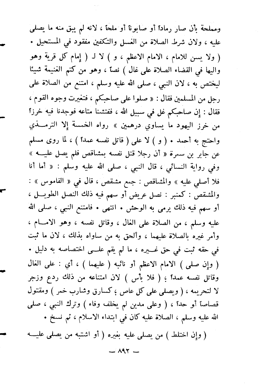 فَامْتَنَعَ النَّبِيُّ - صَلَّى اللَّهُ عَلَيْهِ وَسَلَّمَ - مِنْ الصَّلَاةِ عَلَى الْغَالِّ، وَقَاتِلِ نَفْسِهِ، وَهُوَ الْإِمَامُ، وَأَمَرَ غَيْرَهُ بِالصَّلَاةِ عَلَيْهِمَا، وَأَلْحَقَ بِهِ مَنْ سَاوَاهُ بِذَلِكَ؛ لِأَنَّ مَا ثَبَتَ فِي حَقِّهِ ثَبَتَ فِي حَقِّ غَيْرِهِ، مَا لَمْ يَقُمْ عَلَى اخْتِصَاصِهِ بِهِ دَلِيلٌ. (وَإِنْ صَلَّى) الْإِمَامُ الْأَعْظَمُ أَوْ نَائِبُهُ (عَلَيْهِمَا) ، أَيْ: عَلَى الْغَالِّ وَقَاتِلِ نَفْسِهِ عَمْدًا، (فَلَا بَأْسَ) ؛ لِأَنَّ امْتِنَاعَهُ مِنْ ذَلِكَ رَدْعٌ وَزَجْرٌ لَا لِتَحْرِيمِهِ