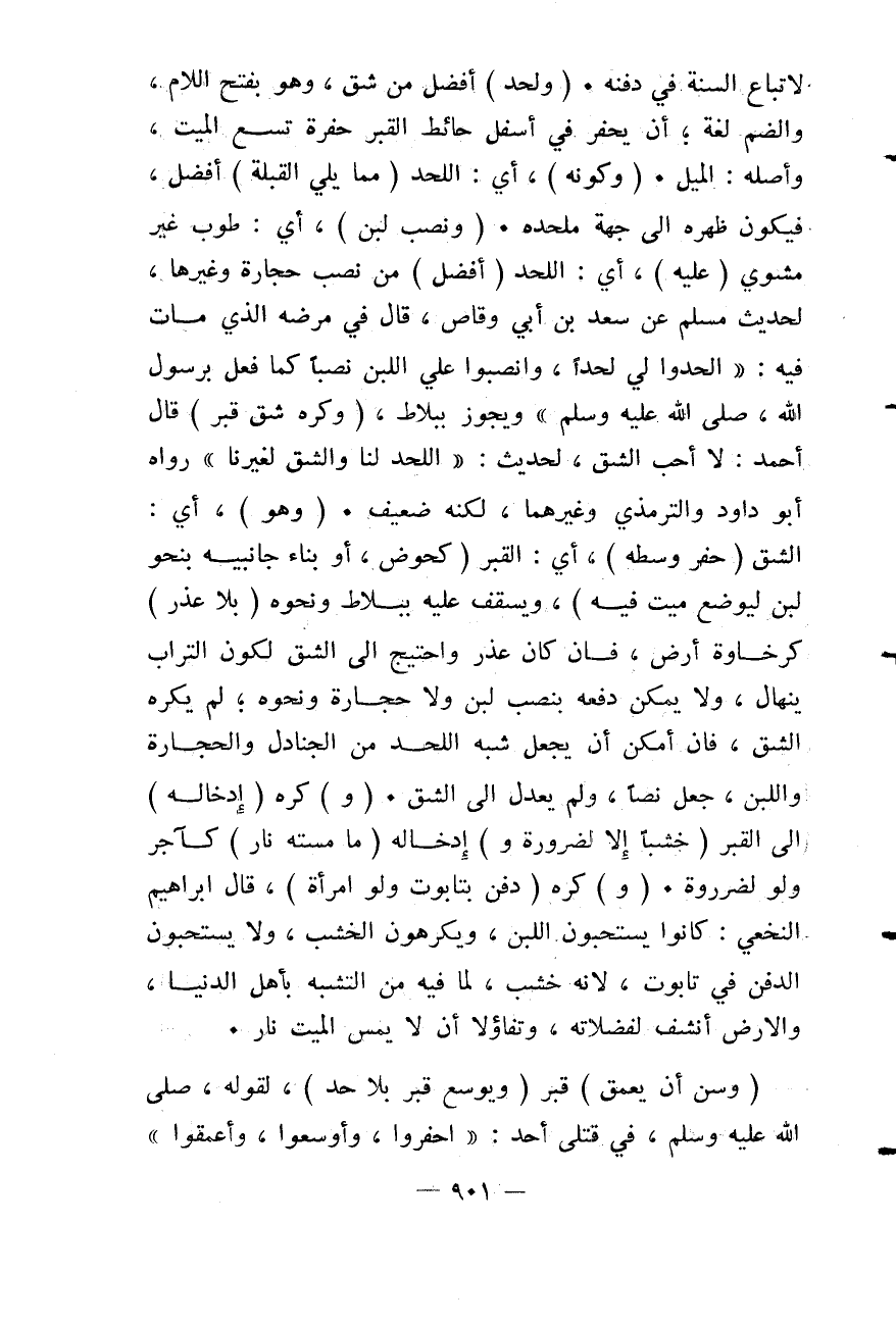 (وَلَحْدٌ) أَفْضَلُ مِنْ شَقٍّ، وَهُوَ بِفَتْحِ اللَّامِ، وَالضَّمُّ لُغَةٌ؛ أَنْ يَحْفِرَ فِي أَسْفَلِ حَائِطِ الْقَبْرِ حُفْرَةً تَسَعُ الْمَيِّتَ، وَأَصْلُهُ: الْمَيْلُ. (وَكَوْنُهُ) ، أَيْ: اللَّحْدِ (مِمَّا يَلِي الْقِبْلَةَ) أَفْضَلُ، فَيَكُونُ ظَهْرُهُ إلَى جِهَةِ مُلْحِدِهِ. (وَنَصْبُ لَبِنٍ) ، أَيْ: طُوبٍ غَيْرِ مَشْوِيٍّ (عَلَيْهِ) ، أَيْ: اللَّحْدِ (أَفْضَلُ) مِنْ نَصْبِ حِجَارَةٍ وَغَيْرِهَا، لِحَدِيثِ مُسْلِمٍ عَنْ «سَعْدِ بْنِ أَبِي وَقَّاصٍ، قَالَ فِي مَرَضِهِ الَّذِي مَاتَ فِيهِ: أَلْحِدُوا لِي لَحْدًا، وَانْصِبُوا عَلَيَّ اللَّبِنَ نَصْبًا كَمَا فُعِلَ بِرَسُولِ اللَّهِ - صَلَّى اللَّهُ عَلَيْهِ وَسَلَّمَ -» وَيَجُوزُ بِبَلَاطٍ، (وَكُرِهَ شَقُّ قَبْرٍ) قَالَ أَحْمَدُ: لَا أُحِبُّ الشَّقَّ لِحَدِيثِ: «اللَّحْدُ لَنَا وَالشَّقُّ لِغَيْرِنَا» رَوَاهُ أَبُو دَاوُد وَالتِّرْمِذِيُّ وَغَيْرُهُمَا، لَكِنَّهُ ضَعِيفٌ. (وَهُوَ) ، أَيْ: الشَّقُّ (حَفْرُ وَسَطِهِ) ، أَيْ: الْقَبْرِ (كَحَوْضٍ، أَوْ بِنَاءُ جَانِبَيْهِ بِنَحْوِ لَبِنٍ لِيُوضَعَ مَيِّتٌ فِيهِ) ، وَيُسْقَفُ عَلَيْهِ بِبَلَاطٍ وَنَحْوِهِ (بِلَا عُذْرٍ) كَرَخَاوَةِ أَرْضٍ، فَإِنْ كَانَ عُذْرٌ وَاحْتِيجَ إلَى الشَّقِّ لِكَوْنِ التُّرَابِ يَنْهَالُ، وَلَا يُمْكِنُ دَفْعُهُ بِنَصْبِ لَبِنٍ وَلَا حِجَارَةٍ وَنَحْوِهِ؛ لَمْ يُكْرَهْ الشَّقُّ، فَإِنْ أَمْكَنَ أَنْ يَجْعَلَ شِبْهَ اللَّحْدِ مِنْ الْجَنَادِلِ وَالْحِجَارَةِ وَاللَّبِنِ، جَعَلَ نَصًّا، وَلَمْ يَعْدِلْ إلَى الشَّقِّ.